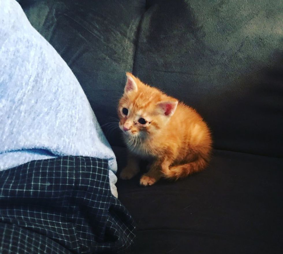 One of his eyes was crusted shut when her son found him. The kind-hearted young man gently wiped off the dirt so the kitten could open his eye. After a much-needed bath and a full belly, the kitten started to perk up.