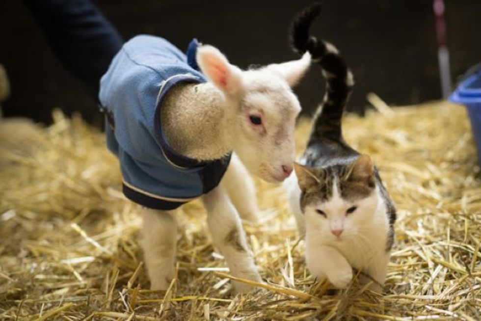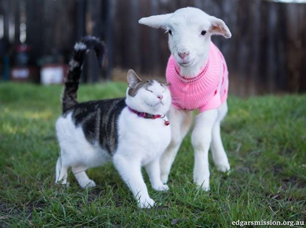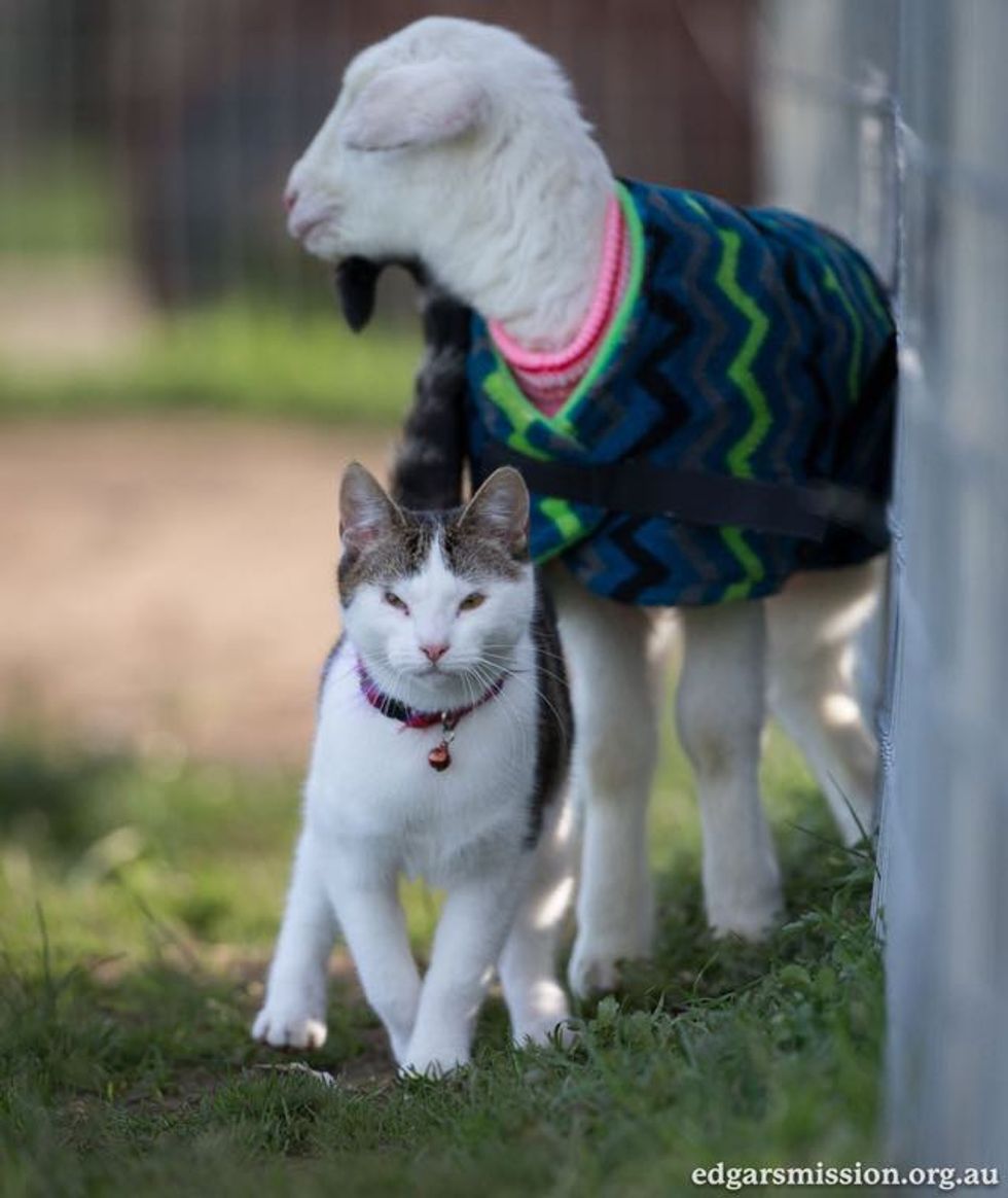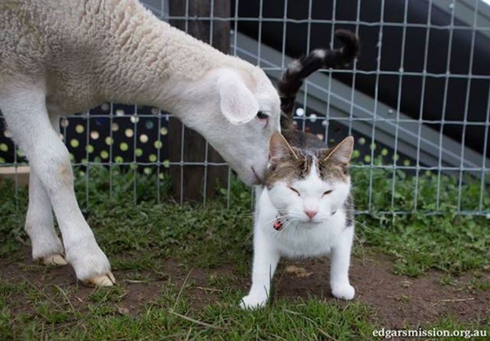 Stitch saying good morning to Remy the rescue lamb.