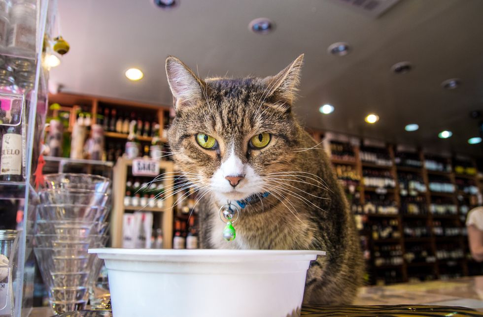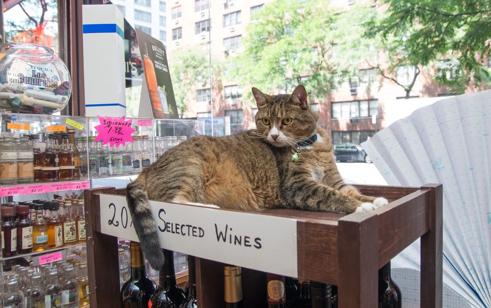 When he's not assessing customer's wine selections from atop the counter, he can be found lounging the display window or perched on the case of discounted wines.
