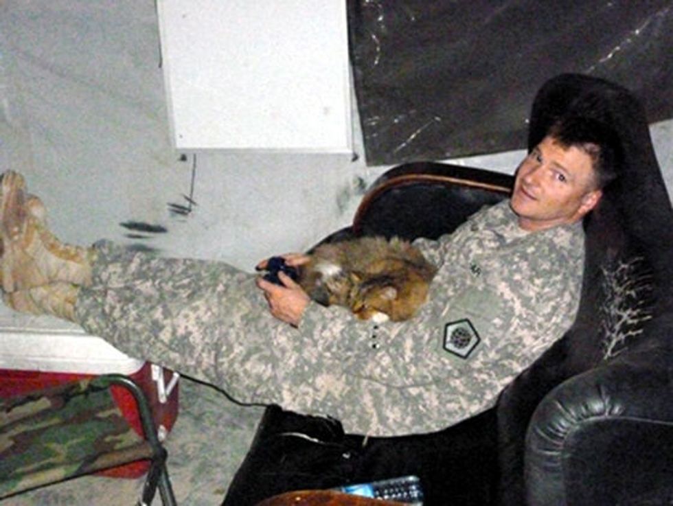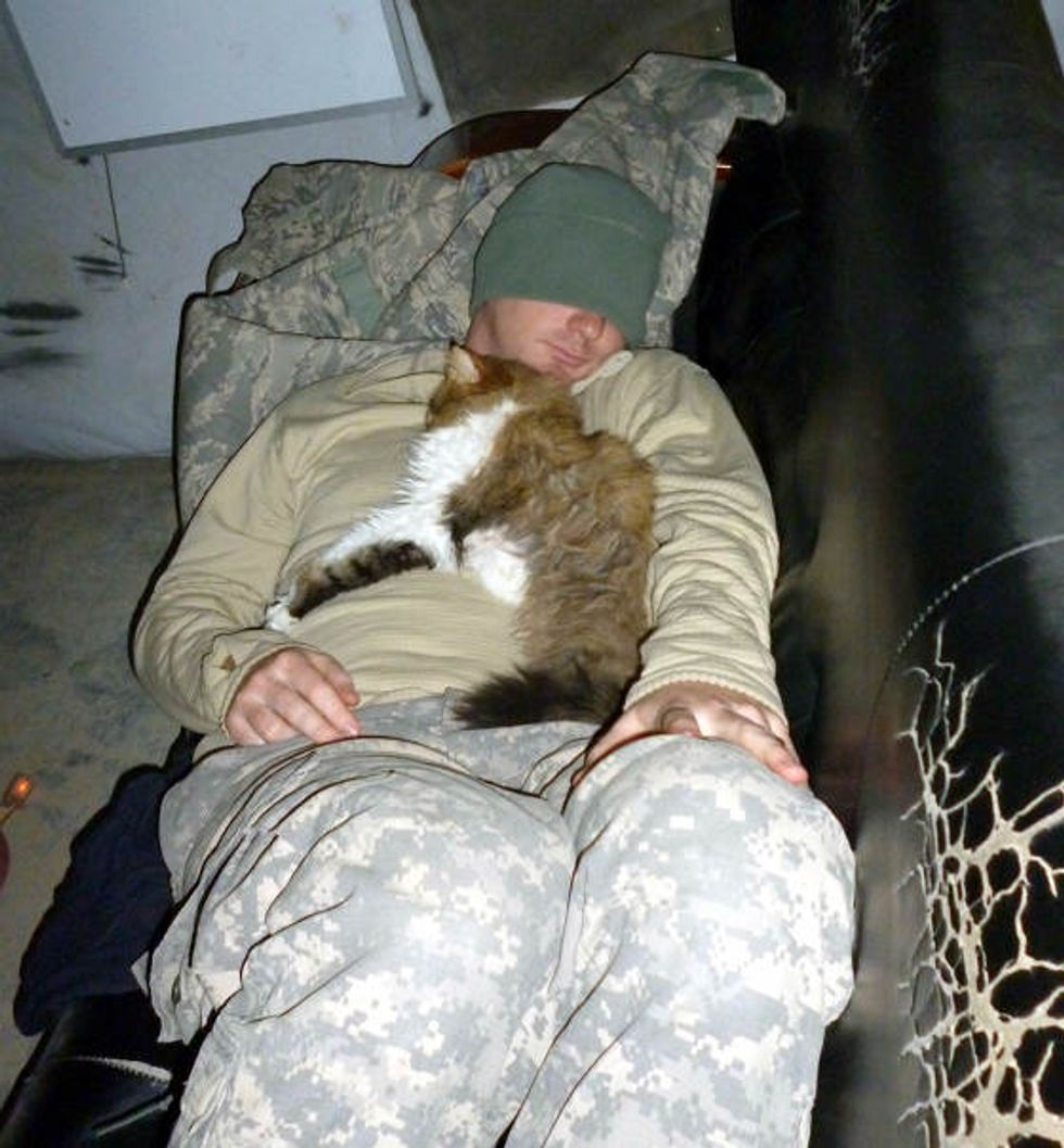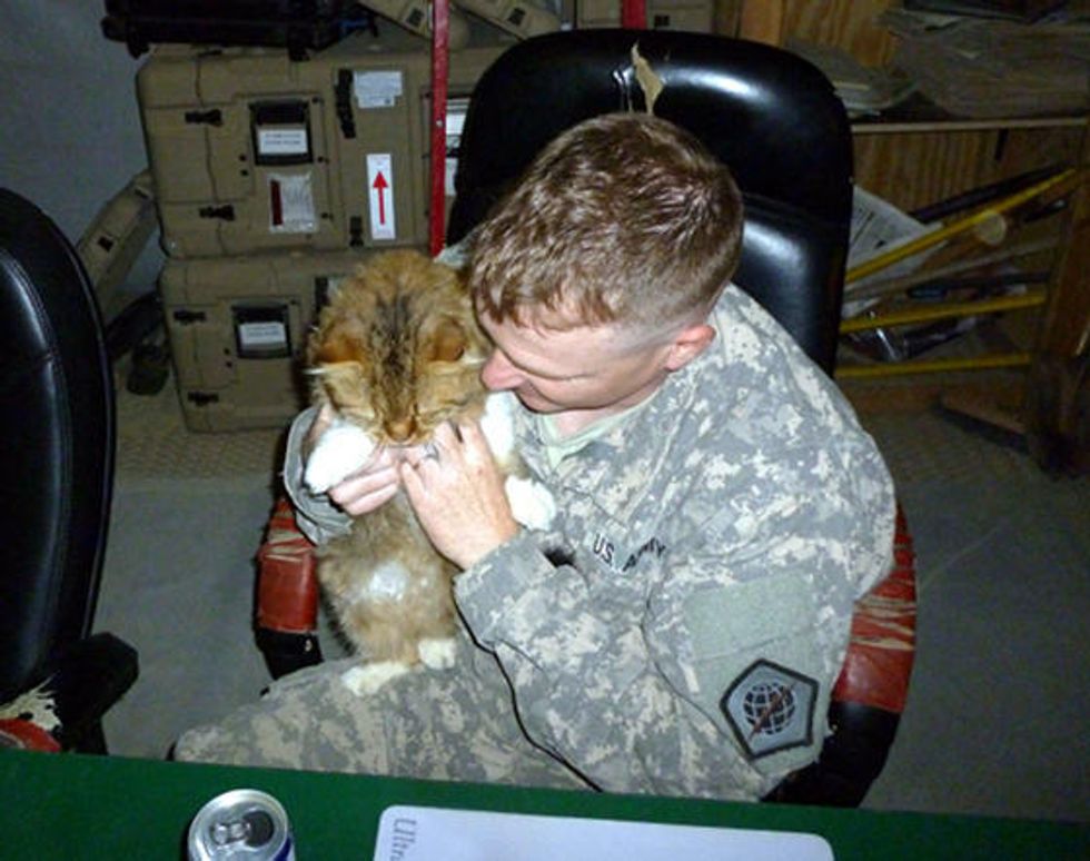"After seeing how he raised my morale and the morale of my team, I couldn't take him away from all those soldiers still [based] there. After having a cat for a few weeks, I can honestly say that more pets for deployed soldiers would help with the depression and probably cut down on the amount of suicides. I'm not saying I considered suicide while deployed, but I had some dark days missing my wife and kids."