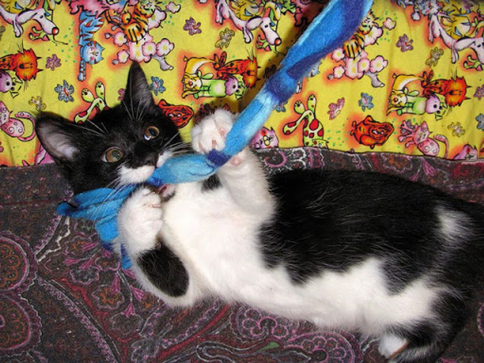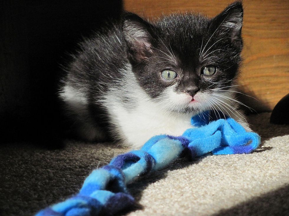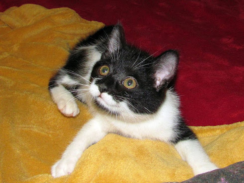 "I have respect for the family that adopted Guinness. When the mom visited, she had a different kitten in mind. However, we talked about personalities and she watched the kittens' behavior. She decided to select the more confident, outgoing Guinness as the Christmas present for her young daughter. On Christmas Eve, Guinness was picked up by the little girl's dad. We had talked about the adjustment period for kittens going to their new homes and what to expect. Guinness, however, didn't listen to what a typical kitten does. Instead, when they opened up the carrier, he strutted out and claimed the home as his, playing with his new family almost immediately."