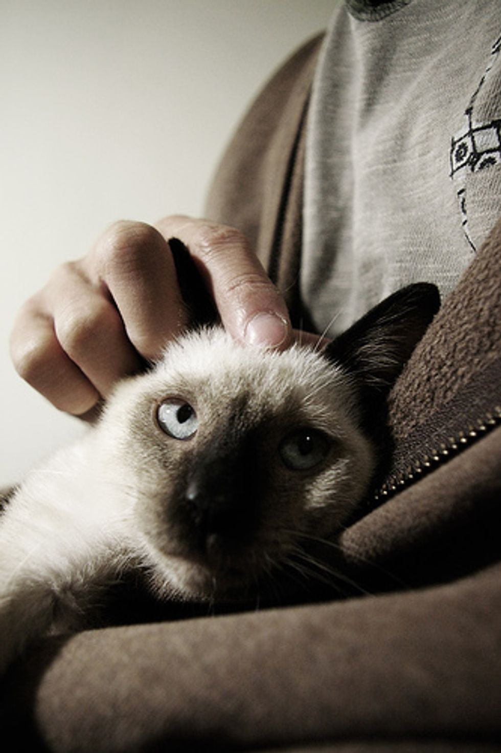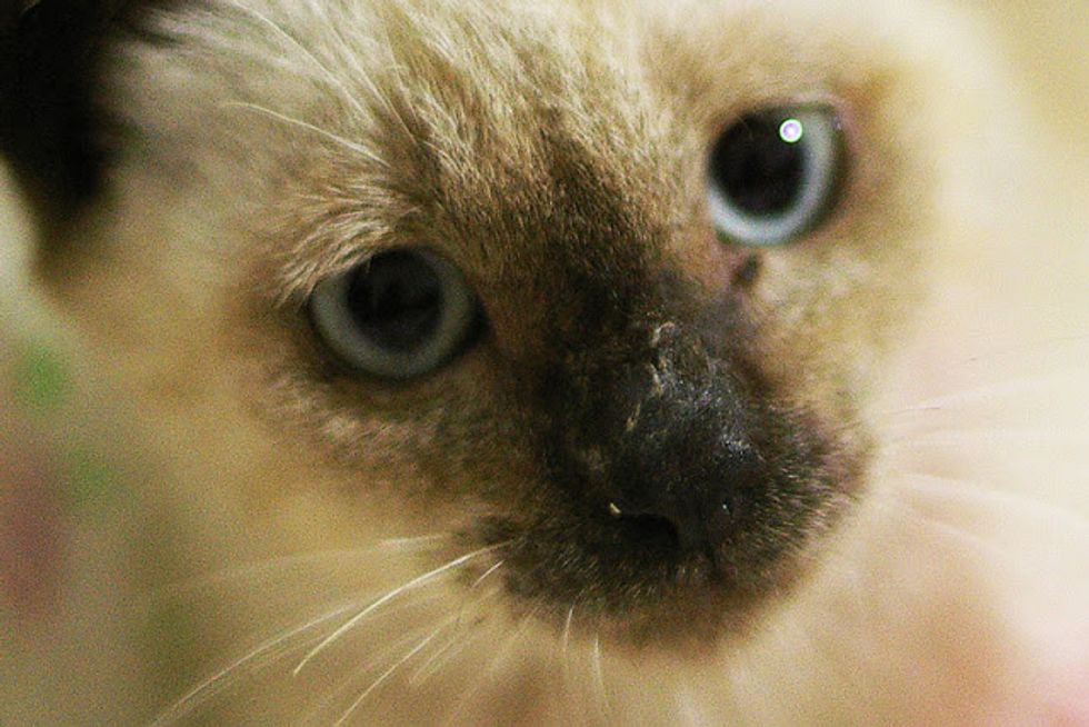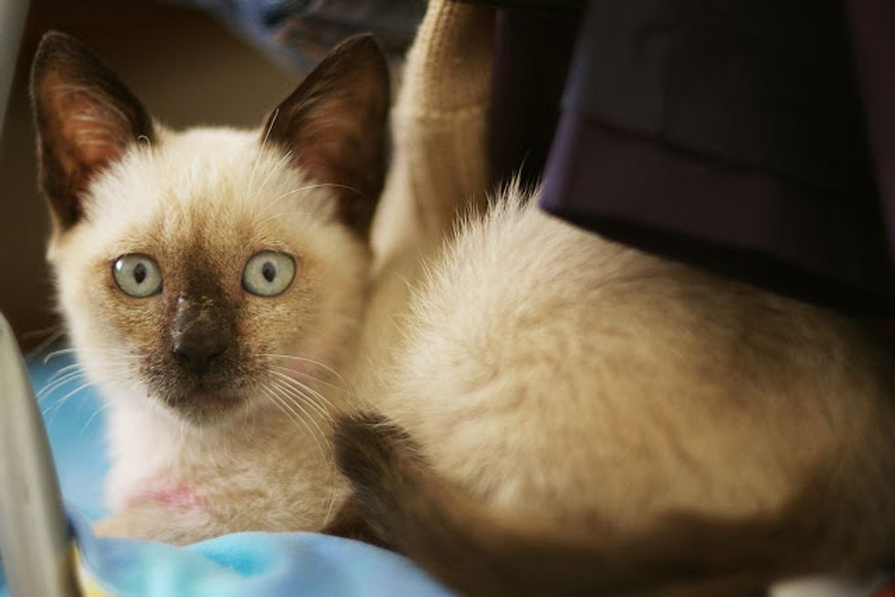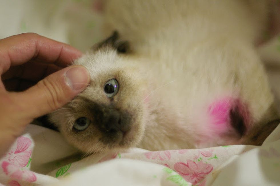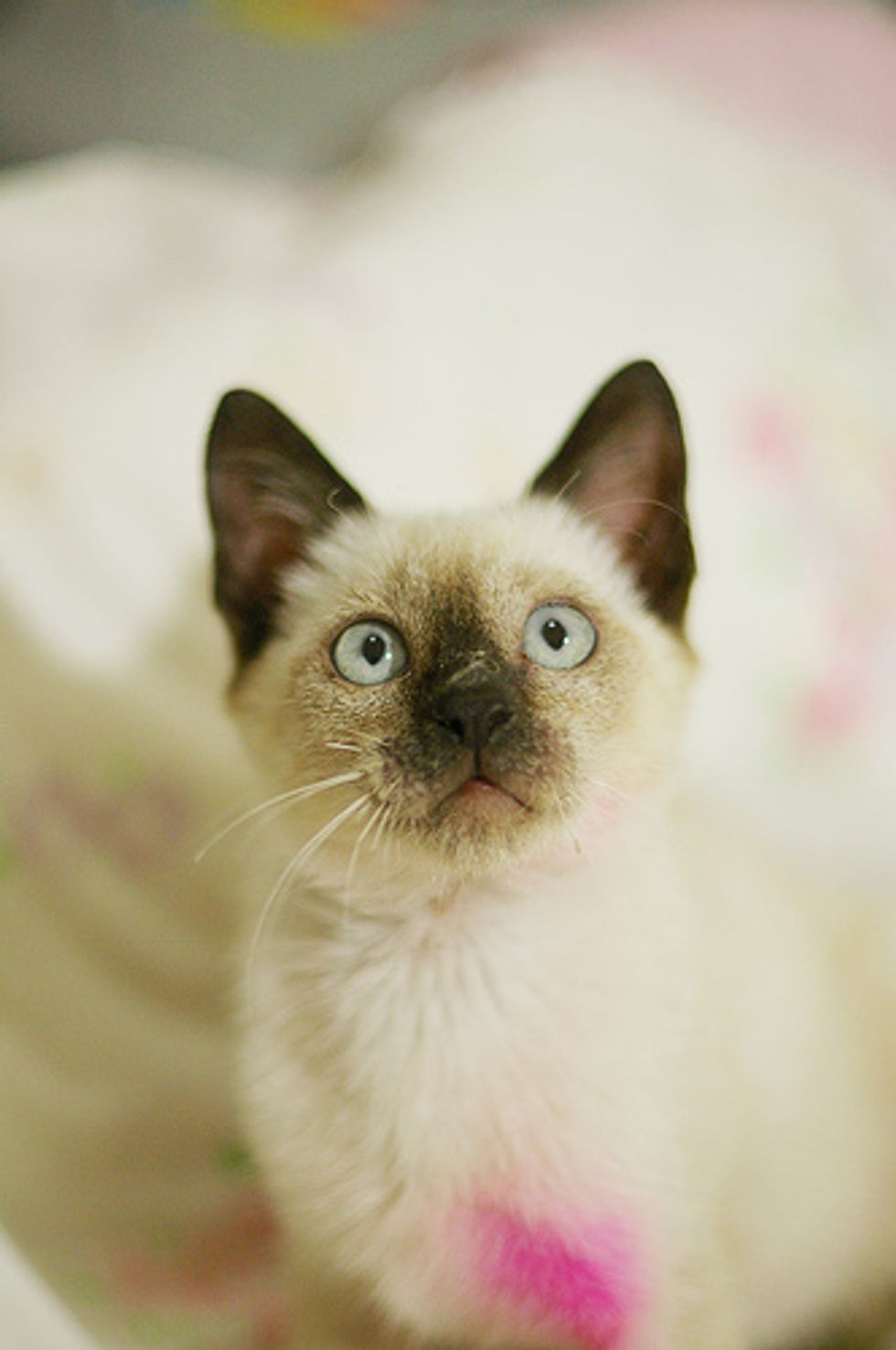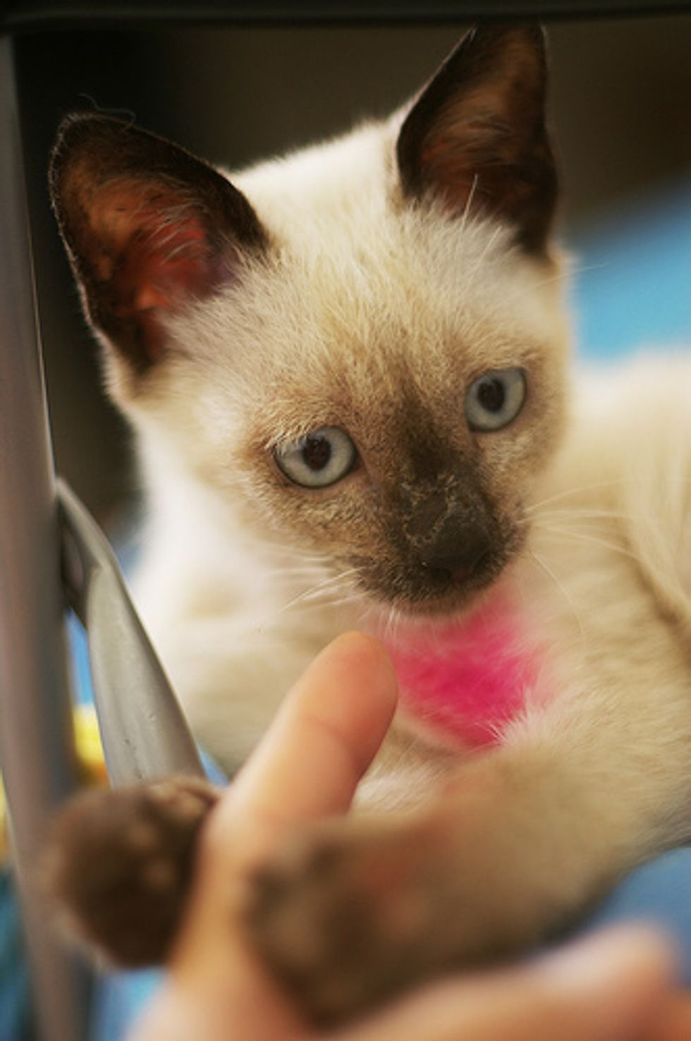 Mocha was found wandering on the street. He was very shy and scared. No one knows for sure where he came from, but he was discovered with pink paint or dye on his chest and a deep scar on his nose. Jeremy K. suspected that he probably had escaped from a pet store or salon.