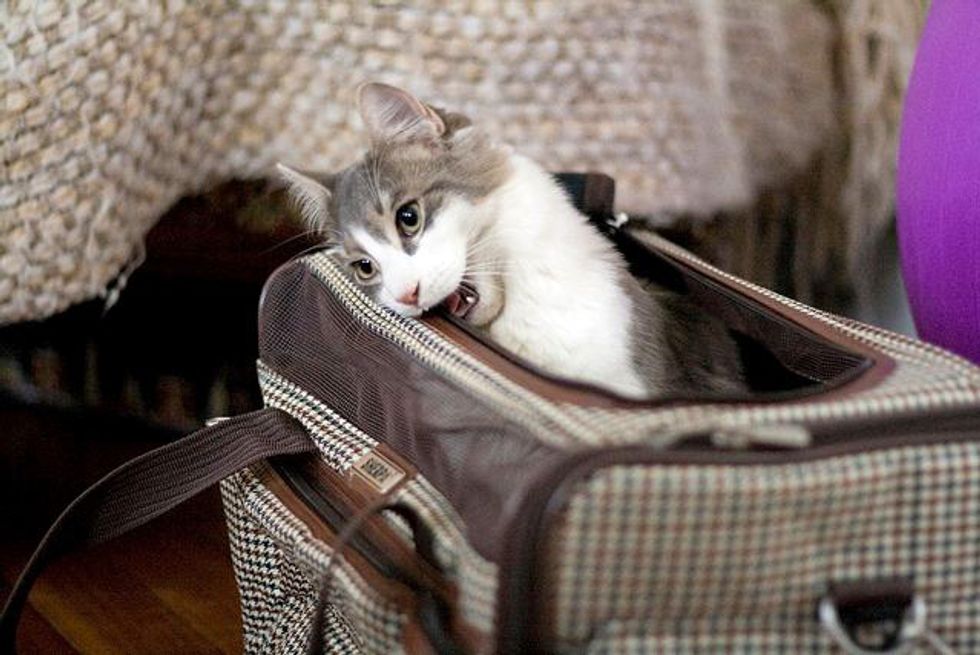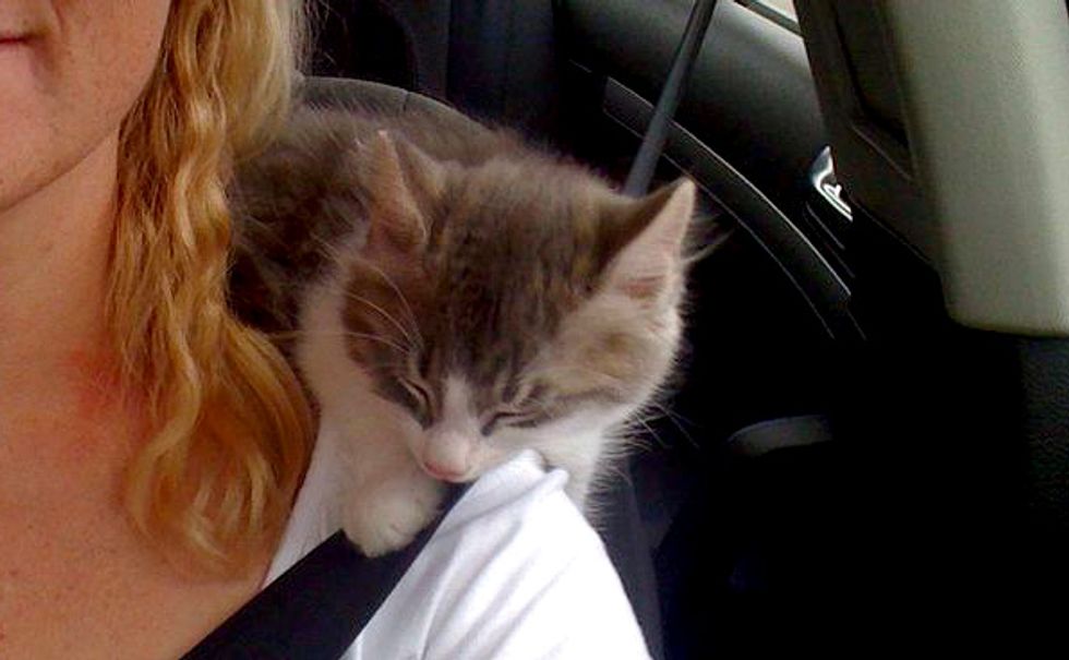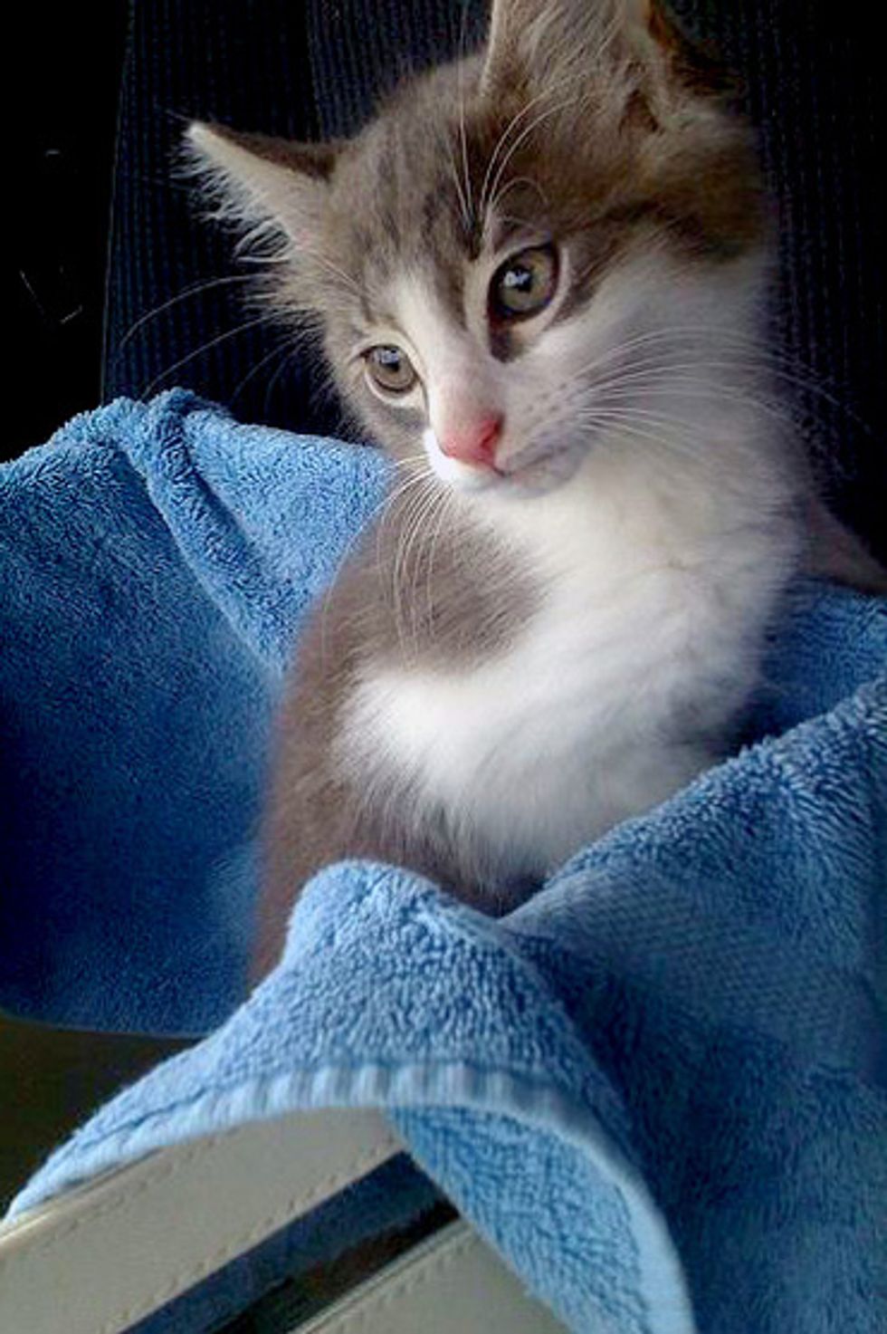 I took to the internet and saw kittens looking for homes in Providence, RI, about 50 miles away. I made arrangements to go to Providence and pick one out. I arrived and knew which one I wanted immediately. The fluffiest gray and white kitty I've ever seen immediately caught my heart. I brought a box with a blanket for the ride home but the little one was having none of it! He meowed and cried from the minute the car started till we stopped at his new home. A little ways into the ride, he crawled up on top of my shoulder and cried as the trees and traffic passed by.