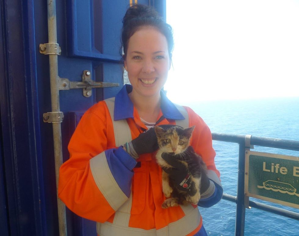 A little calico kitten climbed onto a container ship and made her way onto an offshore oil rig.