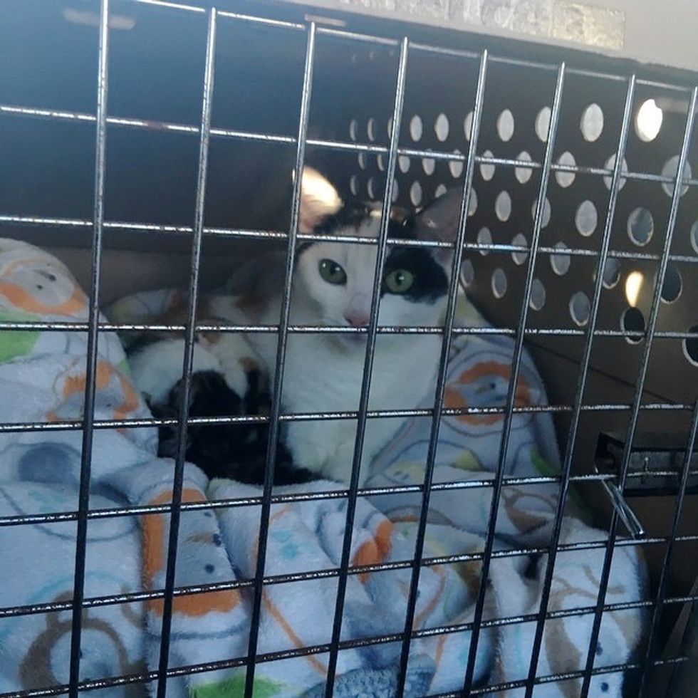 Mama worked diligently, nursing and cleaning her babies during the trip to their new foster home. All five kittens were doing well when they arrived.