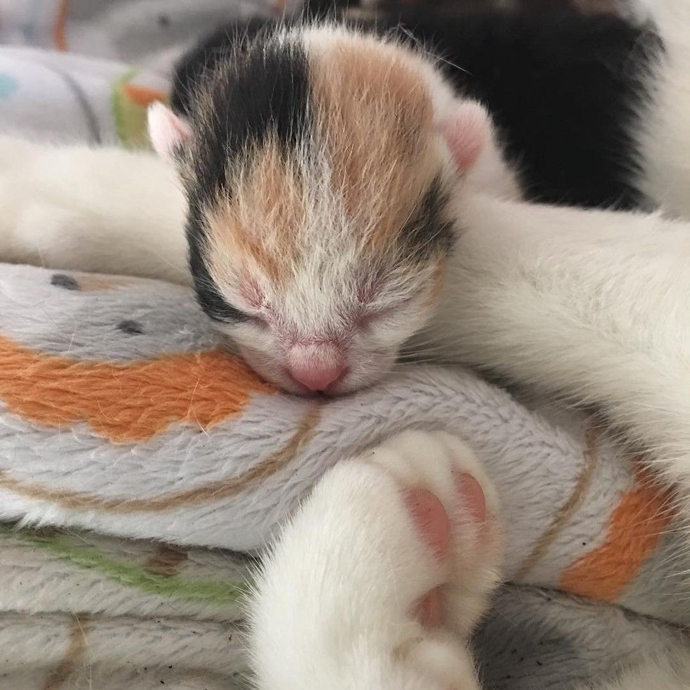 A stray calico Mama was rescued along with her five day-old babies. One of them is a mini version of herself.