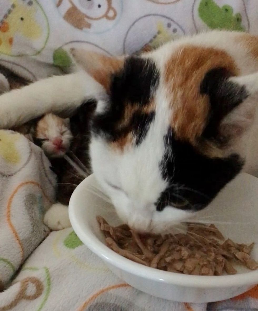 While Mama tried to eat, little Punzie stuck her tiny head out for a whiff. She couldn't see, but she surely could sniff. "Mom was so hungry! She ate an entire can of cat food in 3 minutes," Randolph said.