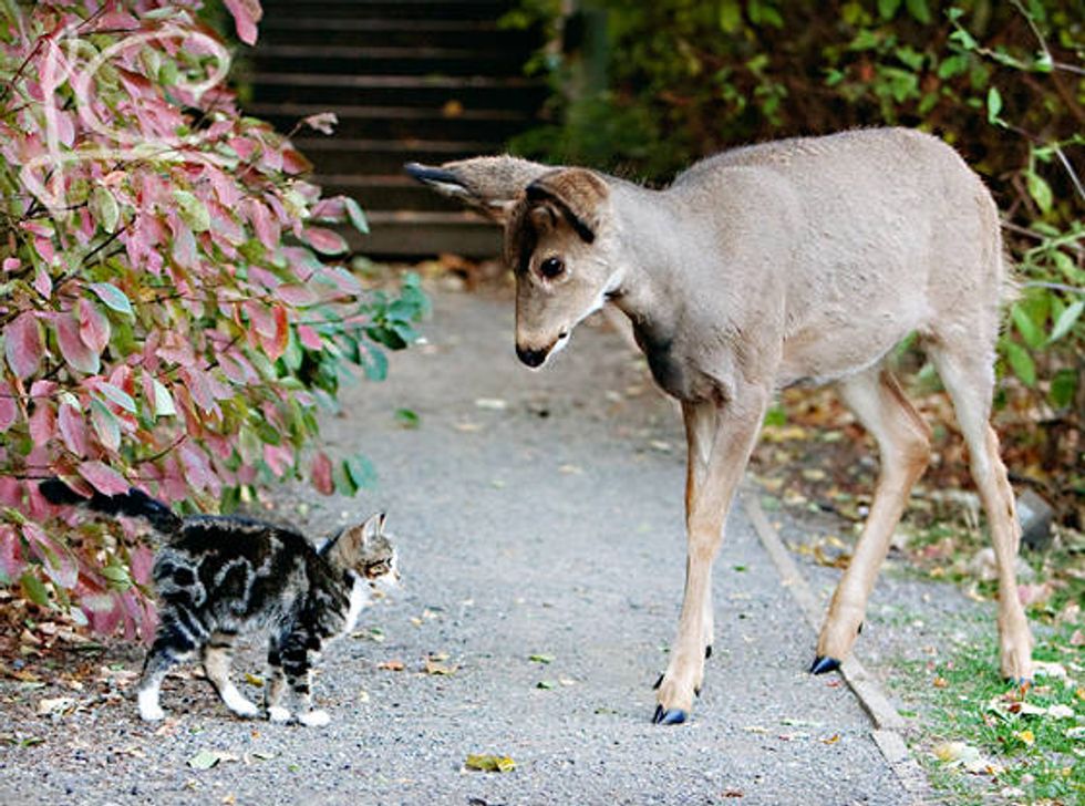 A stray cat and two deers crossed each other's paths. 15 minutes after they met, something incredible happened.