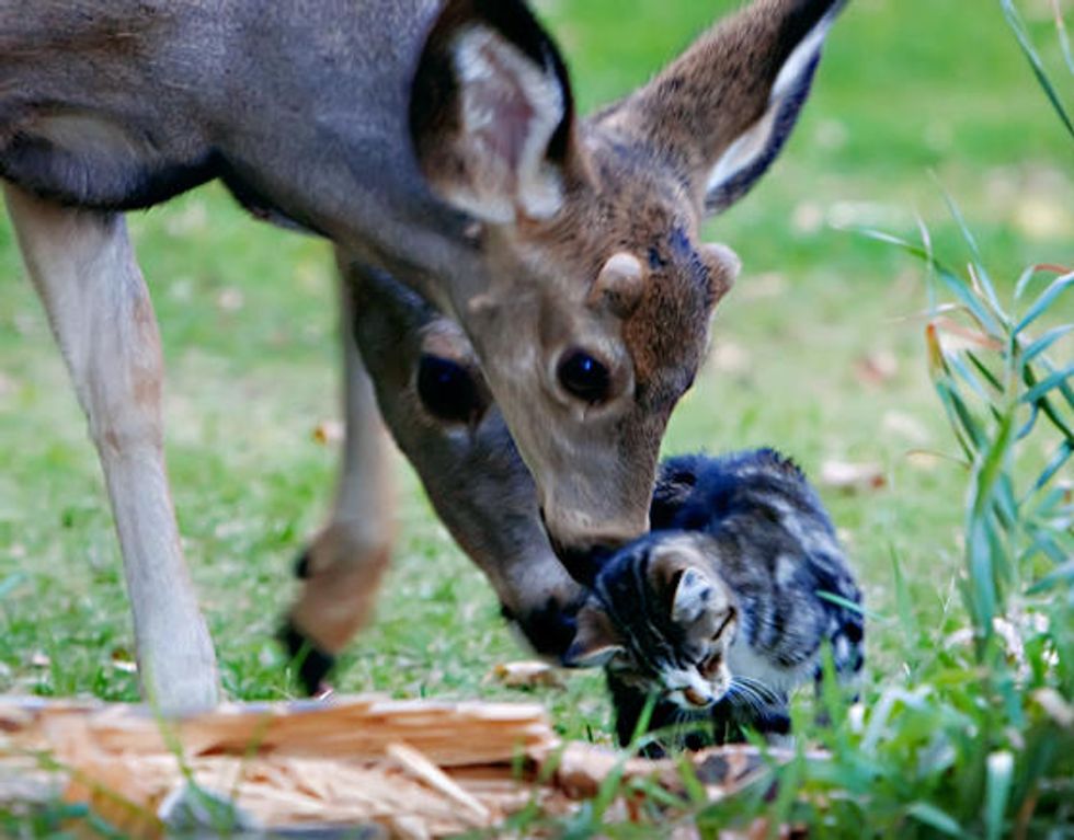 "After about 15 minutes, both deer were actually nuzzling and licking the cat, who was rubbing up against them."
