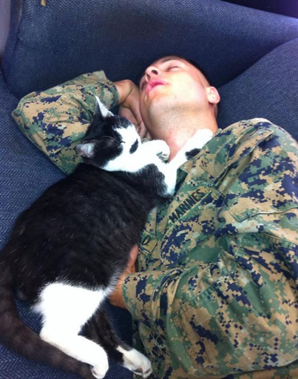 A black and white stray cat made his way into the hearts of the marines in Okinawa Japan. He became a cuddly buddy. "He would snuggle up to people sleeping during lunch without them knowing," said reddit user Squillbill.