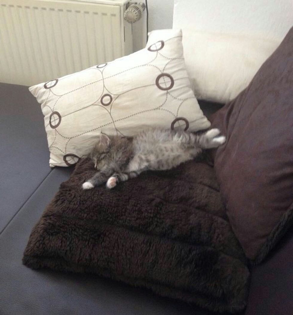 The tiny fur baby is loving his new abode, his humans, two dogs and another cat.