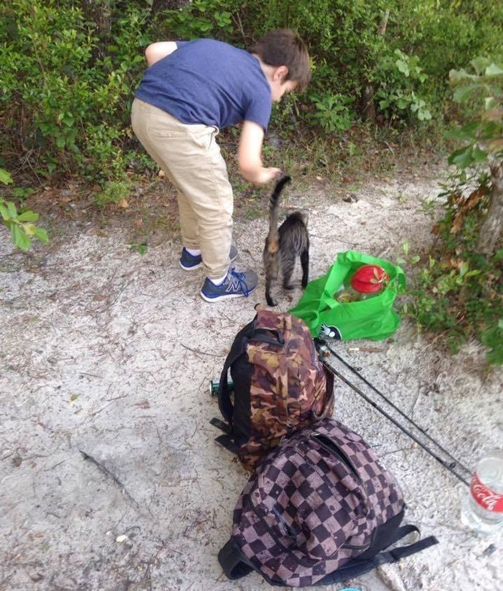 While he was setting up the tent, his son quickly became friends with the friendly feline. He petted the kitty on her back, and the tabby rubbed his legs and followed him around as if they were old pals.