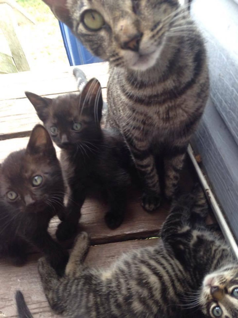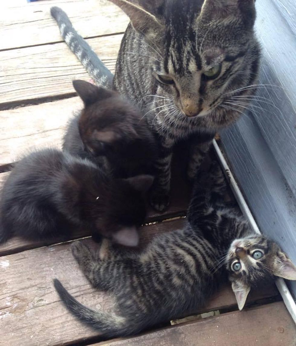 The friendly tabby came back with three kittens and introduced them to her human friends.