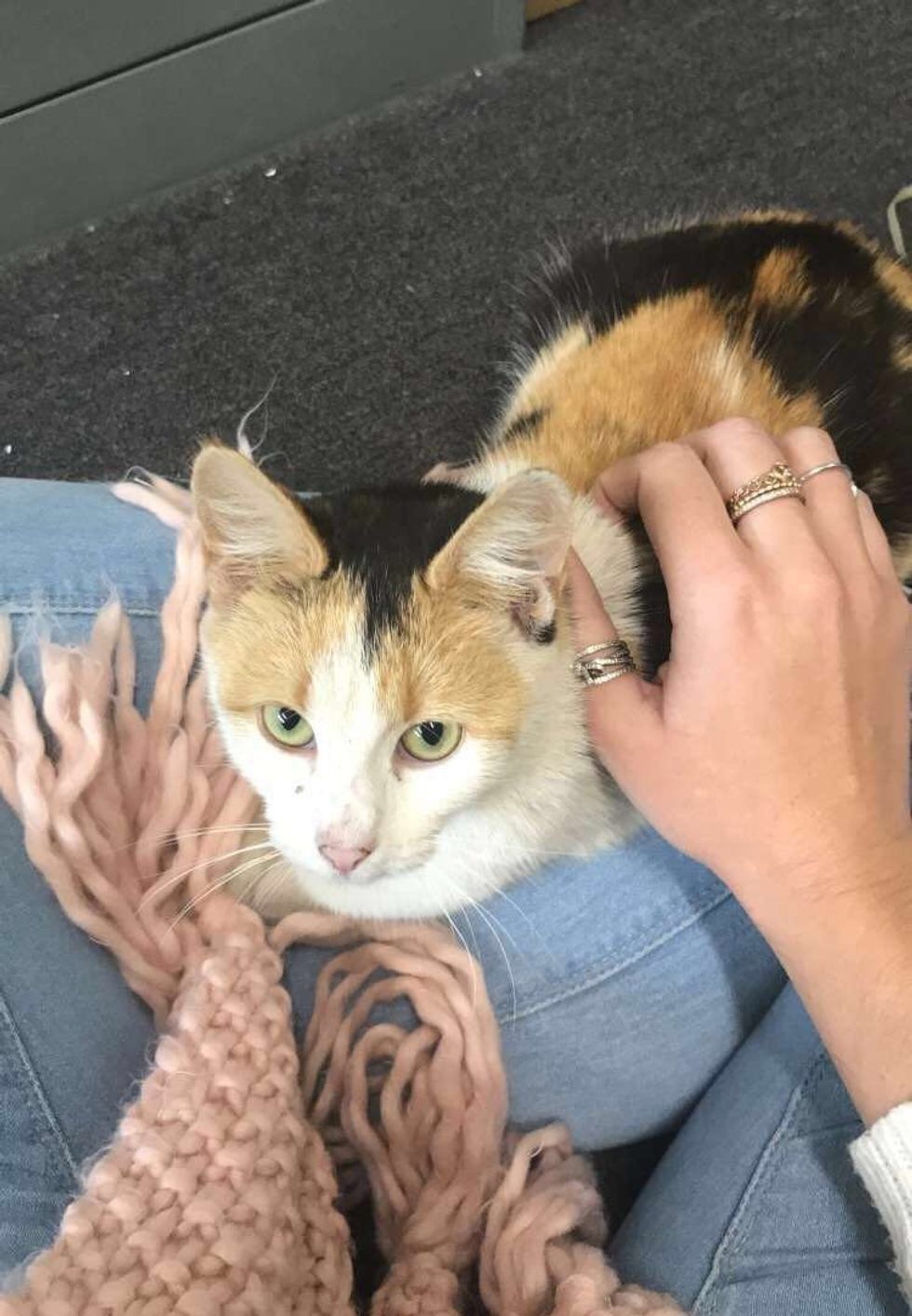 After a few weeks, Shelby managed to sit next to the kitty as she ate. "I tried petting her, and she would let me only while she ate. However, after a few days of petting her she became incredibly friendly. She would rub up against me, and come and sit in my lap. If I left the door to the office open she would walk in and jump up onto my lap or desk and purr away happily as I worked."