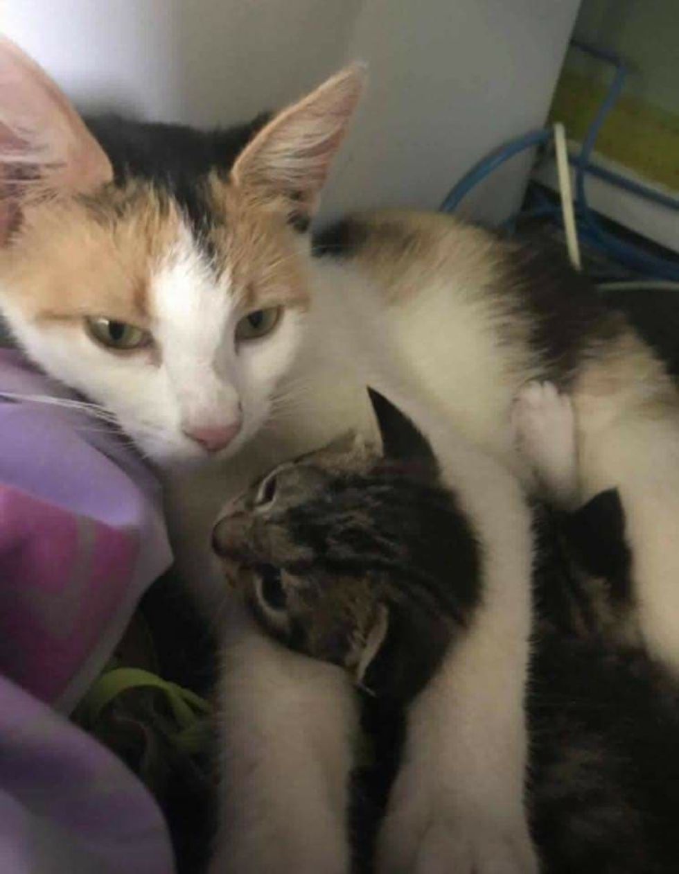 A couple of weeks later, mama cat came back but this time she was not alone.
