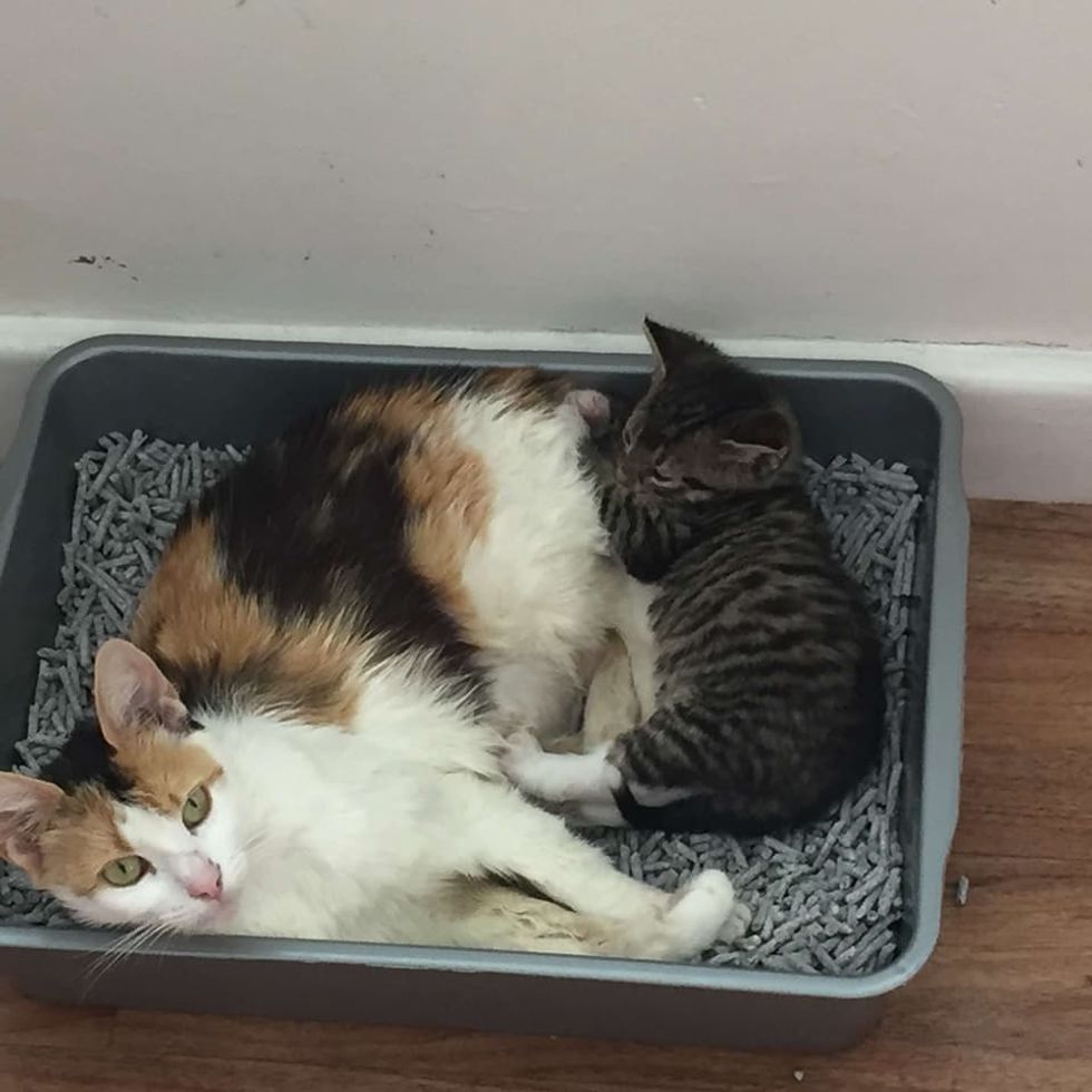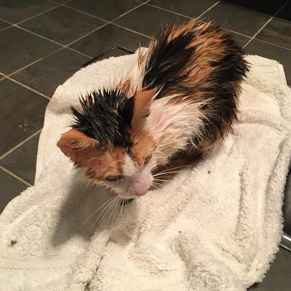 They named the mama cat Shelby after her rescuer. The sweet calico didn't mind taking multiple baths as it is standard ringworm treatment. She was simply happy to have someone to look after them, a roof over their heads, and plenty of good food to eat.