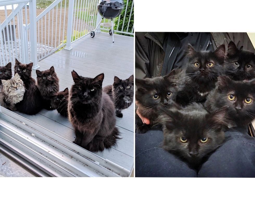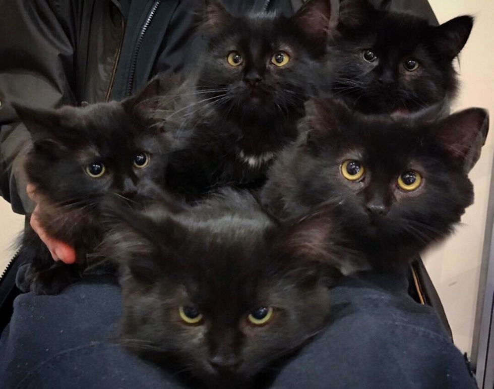 The cat brought her five beautiful black kittens and one adorable tabby to the person that she trusted.