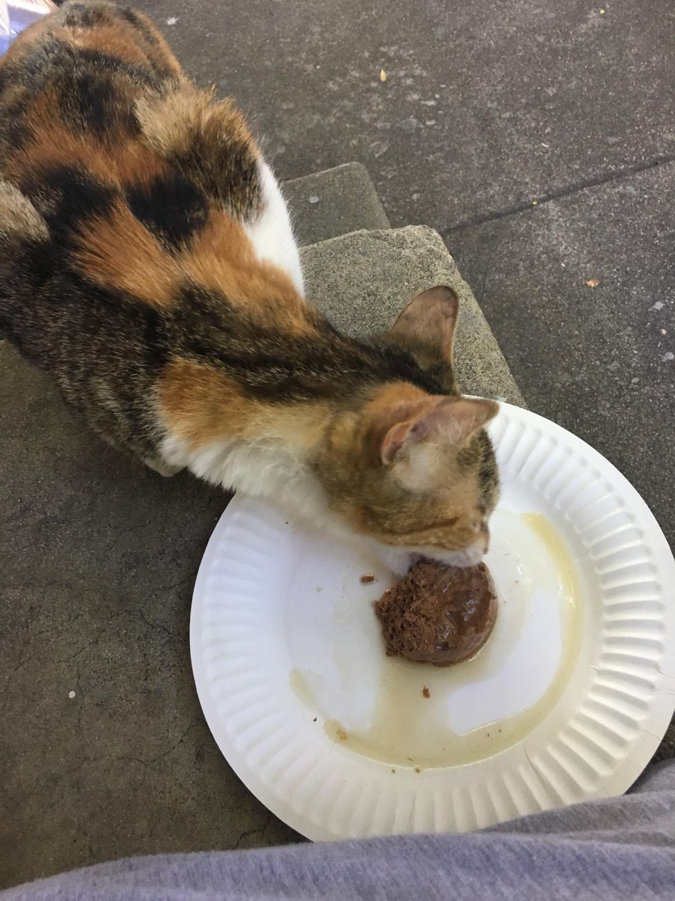 She gave her some food and the hungry kitty wolfed it down as if she hadn't eaten for days. After a hearty meal, she curled up next to her human friend and nuzzled into her arms as if to say "Thank you!"