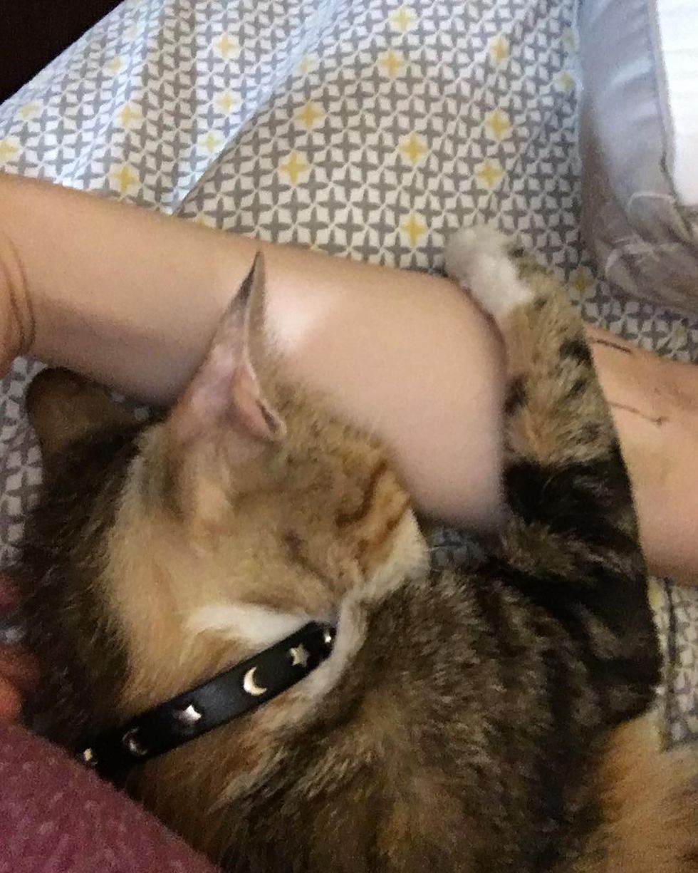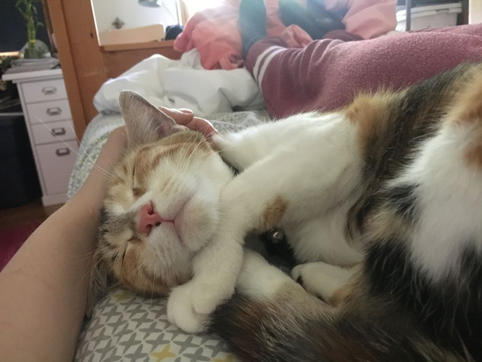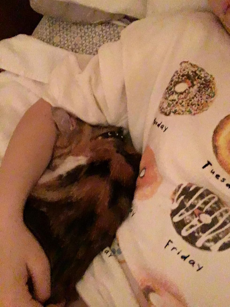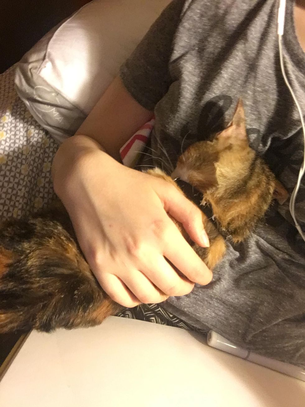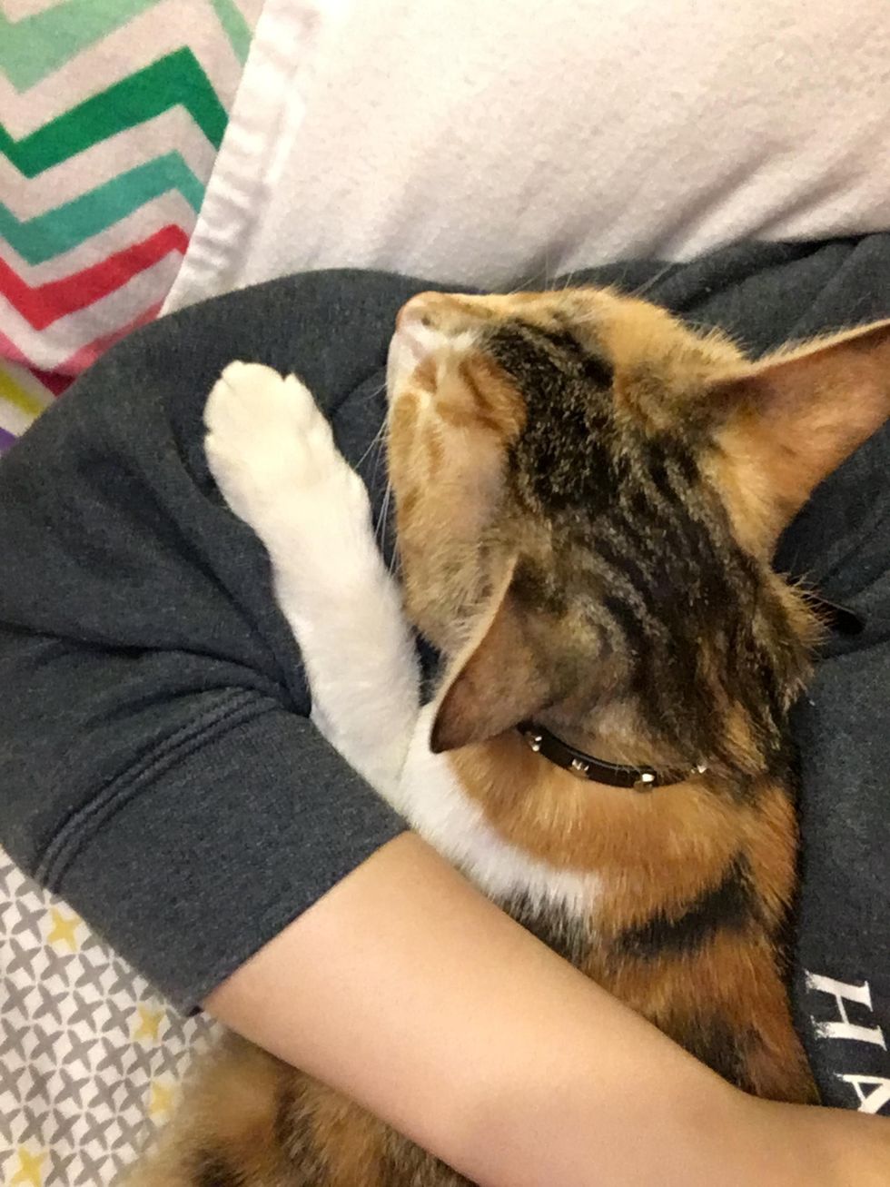 Since day one, she's been cuddling with Kate. The sweet calico follows her human everywhere she goes.