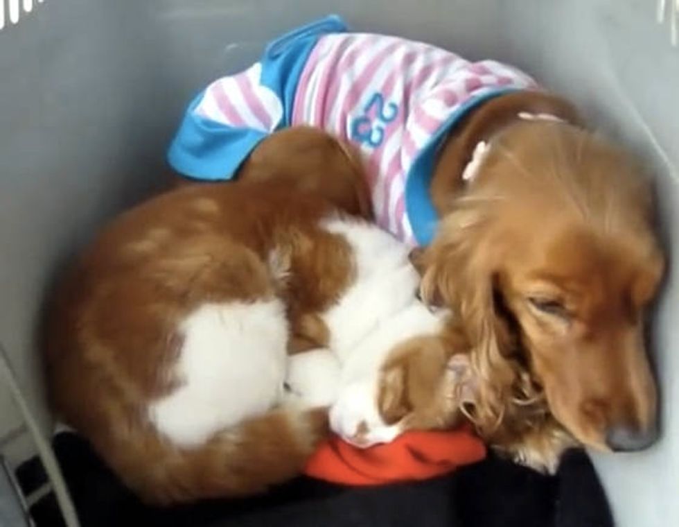 Now they are completely inseparable and always nap next to one another. The kitty is very gentle with his canine friend. When the dog goes into the crate, he follows behind and snuggles up with his buddy.