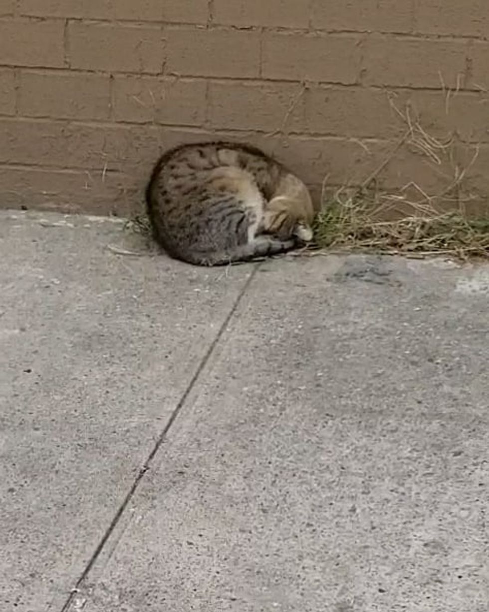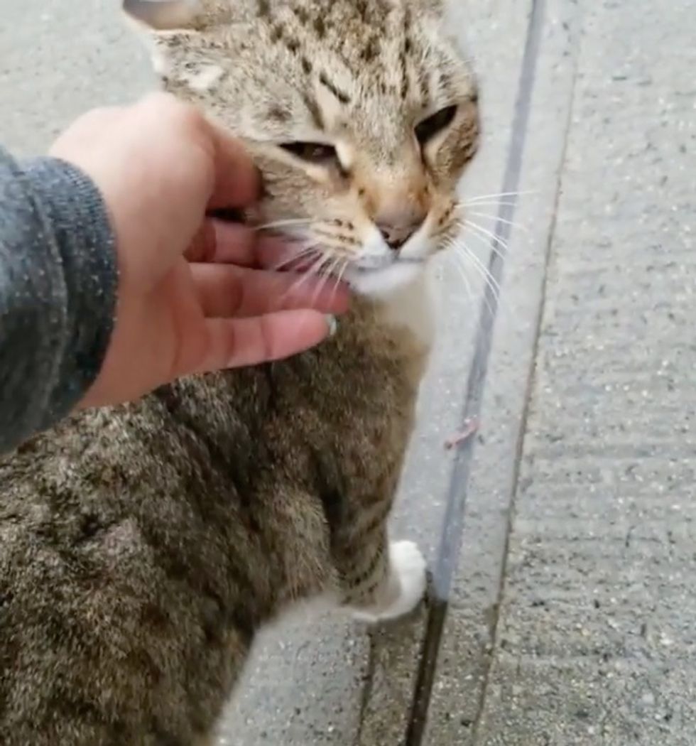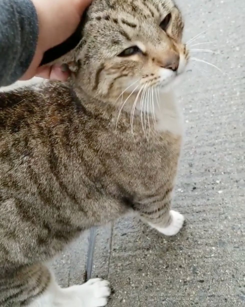 When she arrived, she saw the cat curled up in front of a homeless shelter. The tabby woke up to her voice and sauntered up to her for pets. He was extremely friendly and just wanted attention.