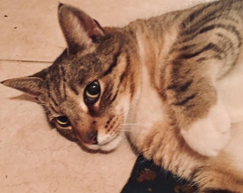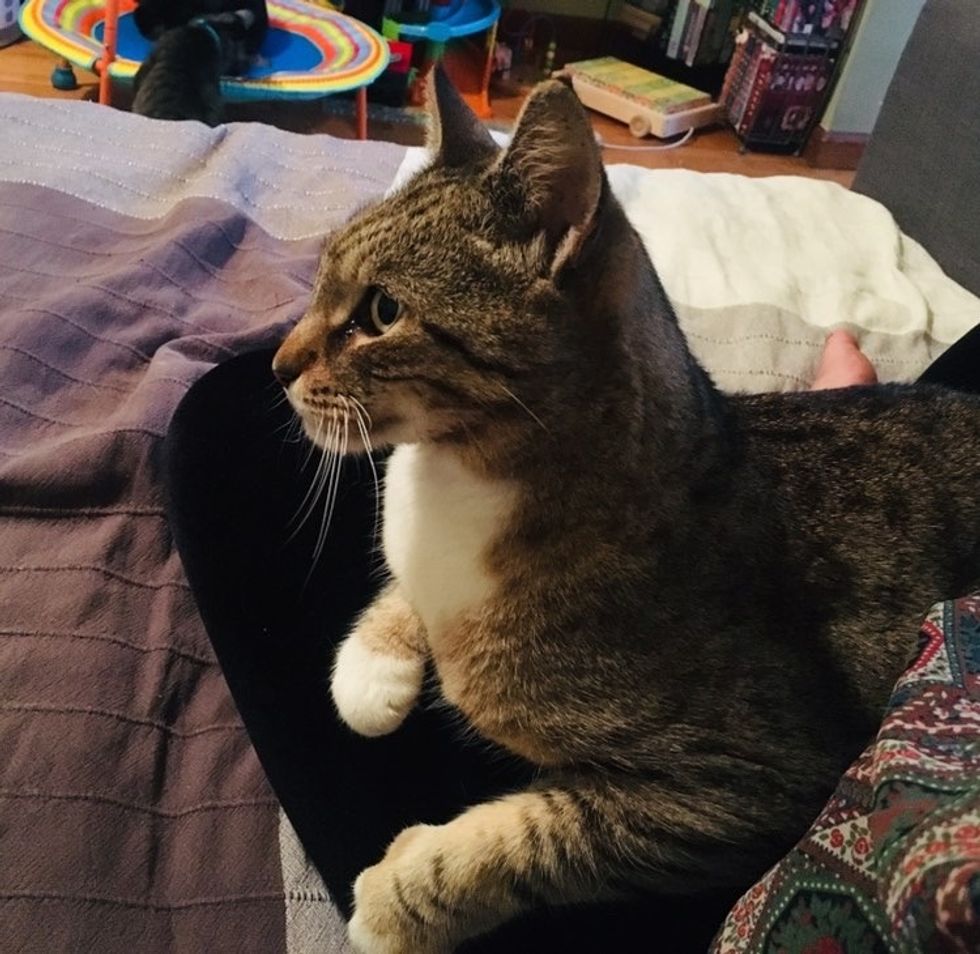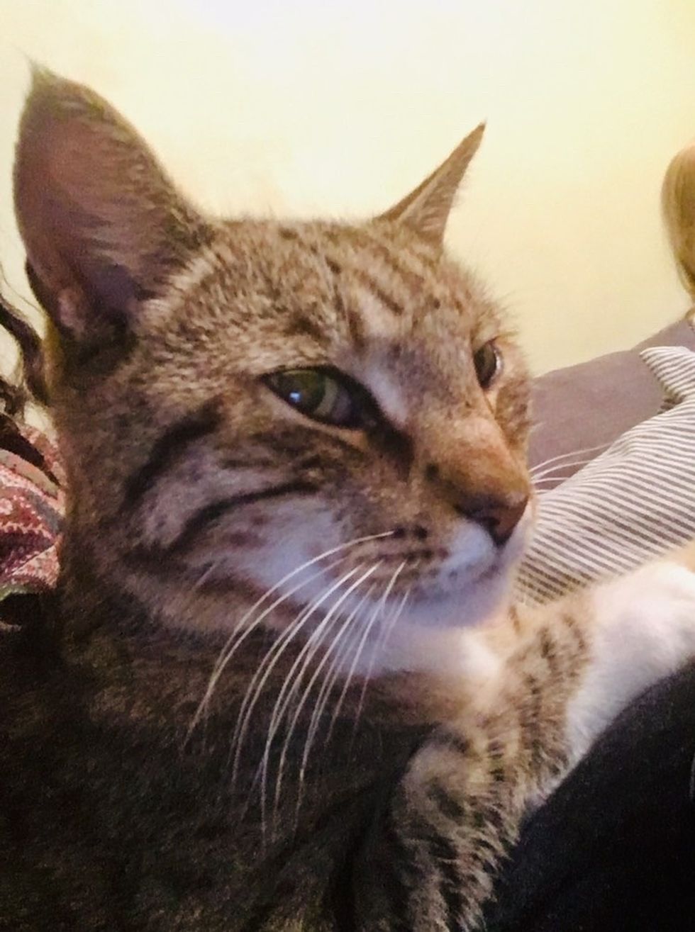 "He is confident and elegant like a tiger. He loves catnip and mealtime! His favorite place is making biscuits on a lap while someone pets his neck and back."