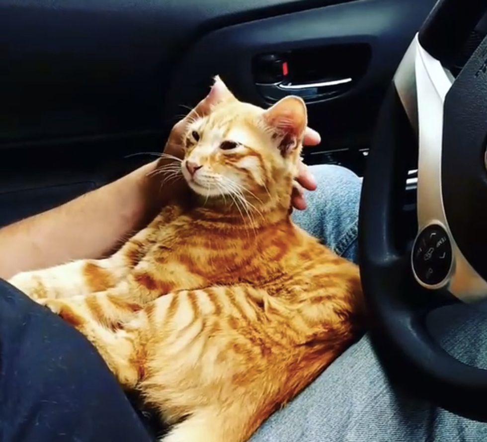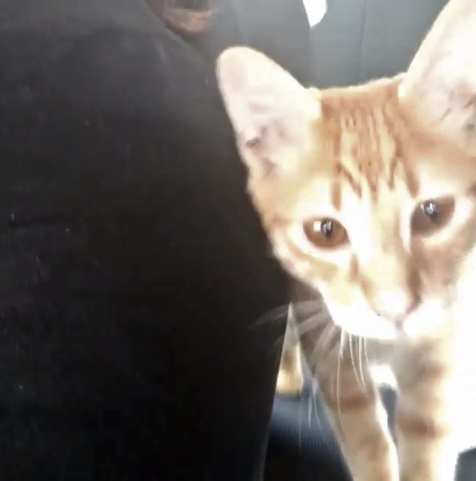 After quickly exploring around the back seat, he walked up to the front and decided to nestle in his human's lap for a nap. They were in a rush to get to the airport but they didn't have the heart to wake the sleeping kitty so they took him along.