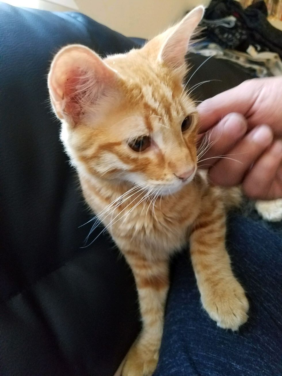 The sweet ginger snuggled with his human during the entire car ride. He blinked and winked at his human friends as if he'd known them all his life.
