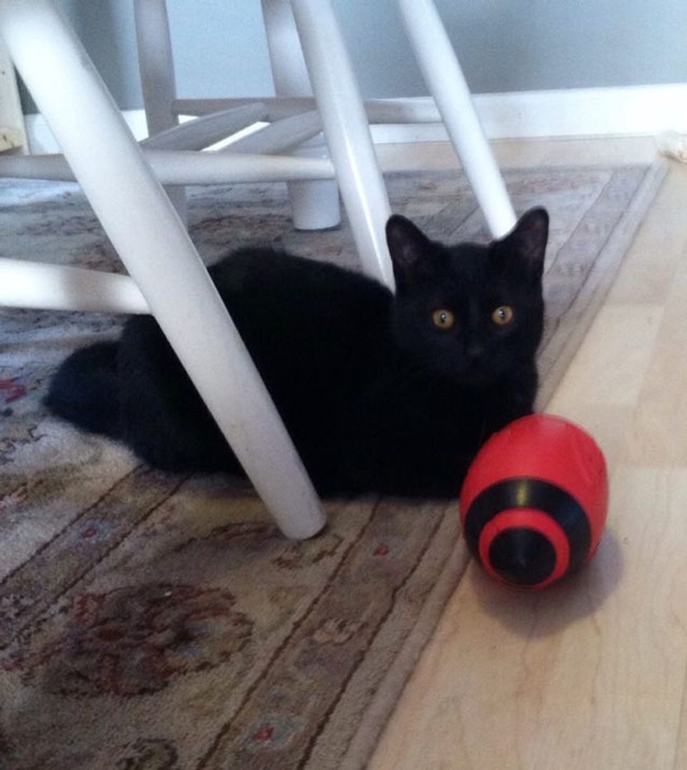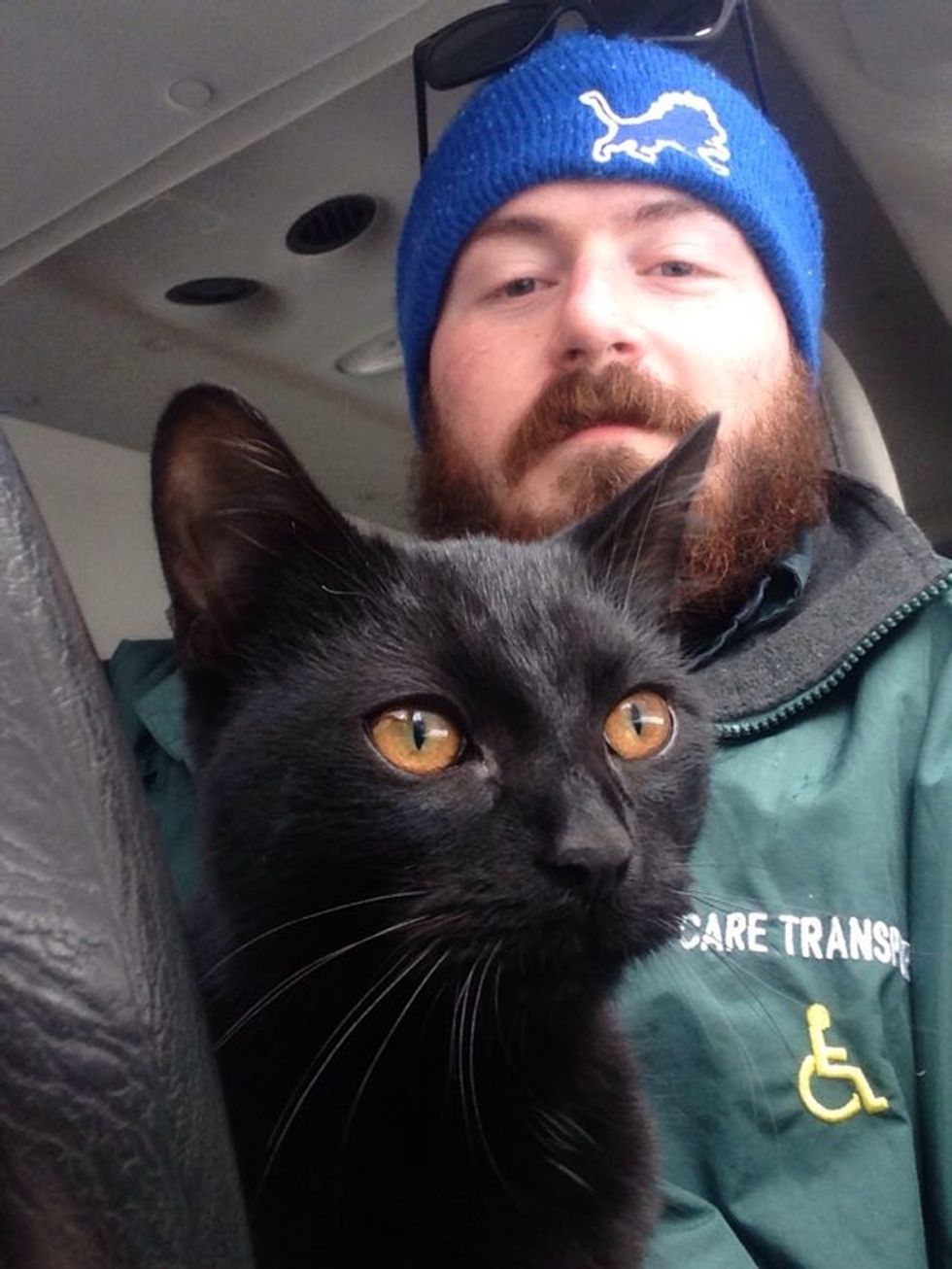 This beautiful black cat settled himself in his work car and didn't want to go. So Jonny asked around the neighborhood to see if the cat belonged to anyone, but couldn't find any. "The guy whose house I was at said it had been outside his place meowing for about two days. Also the neighborhood I was in had about 4 houses that weren't abandoned, and Vet checked for a microchip."