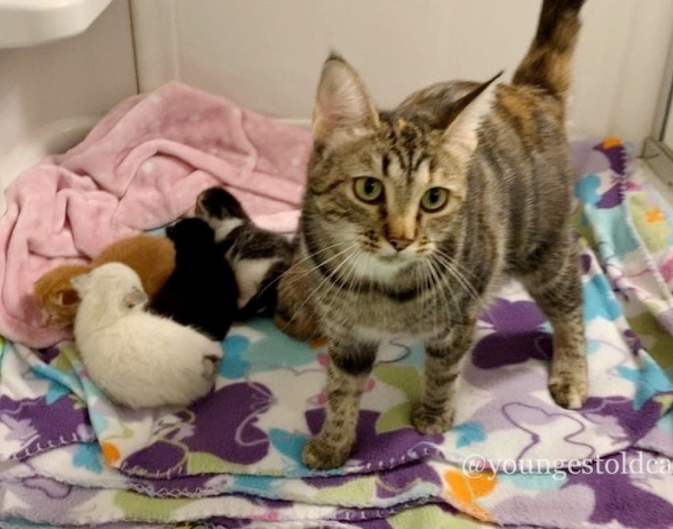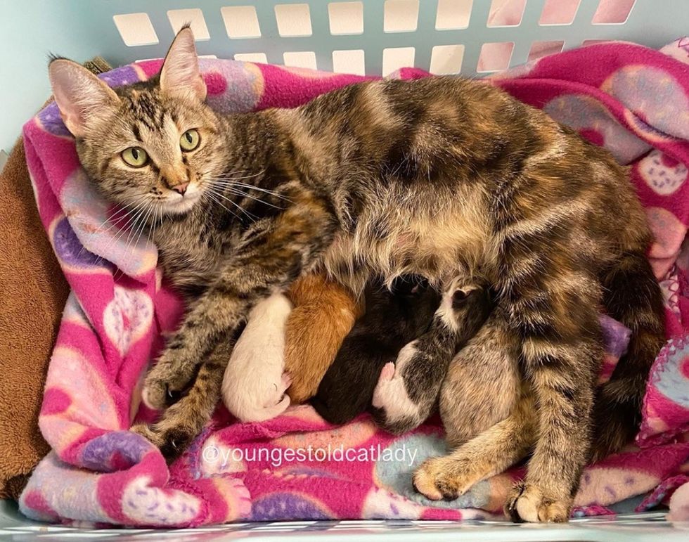 "She's a great mama, but so young. She would have been just as happy to stay a kitten herself with no babies. I'll be so happy for her when her mama role is done and she will get to find a forever home indoors where she can play and be loved on."