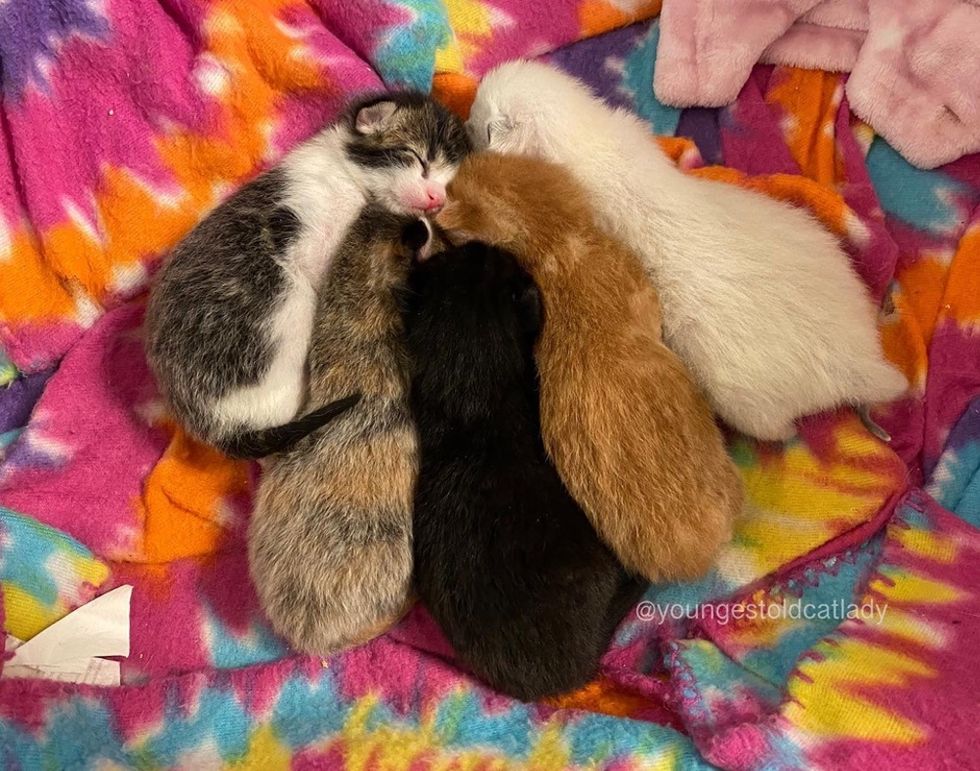 Mama Birdie gave birth to a litter of five healthy kittens (Finch, Hawk, Raven, Robin, and Dove), all with voracious appetites.