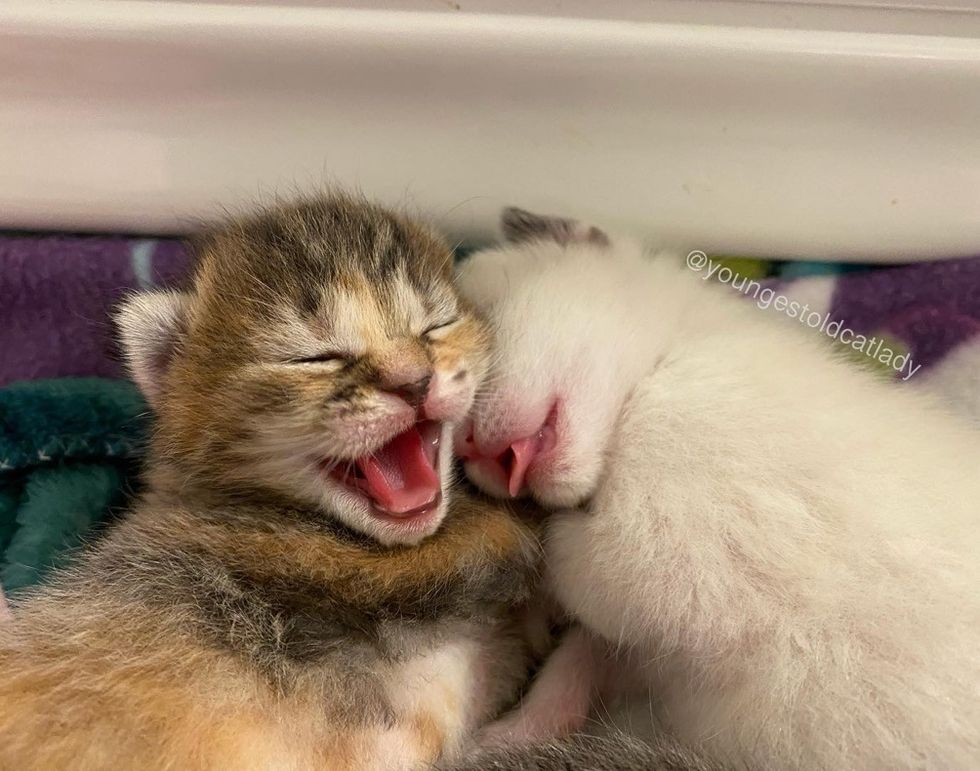 Baby Hawk and Dove quickly mastered the art of tiny hisses. Kittens that age can't see or hear, so they use hissing as a defense mechanism.
