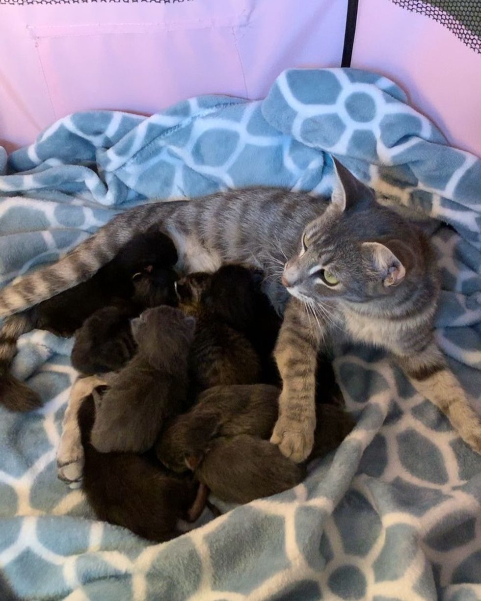 A stray cat was found on the streets of Houston, Texas and brought to a local shelter mid-July. She was just skin and bones and very pregnant. The day after arriving, she went into labor and gave birth to eight kittens.