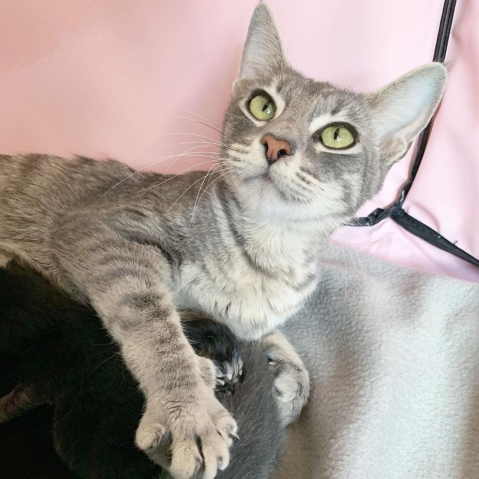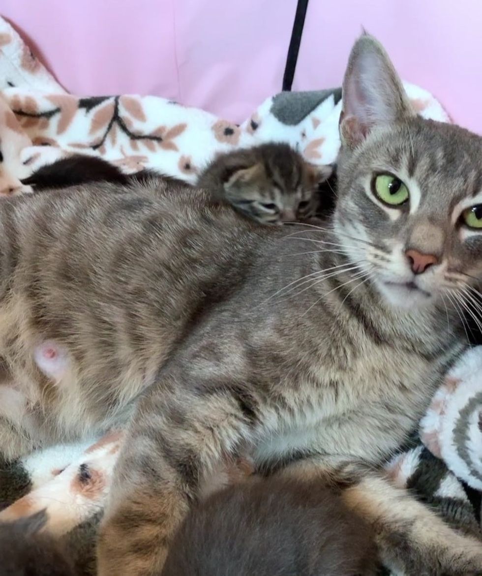 The cat mom whom they named Joan, leaned over to Laine for some pets when she arrived. She was kneading the air with her paws and rumbling with her adorable, sweet purrs.