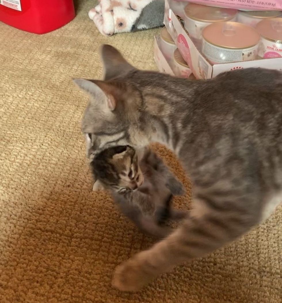 When it's time to clean and vacuum the foster room, mama keeps her babies in a secure spot and covers them with her body until the cleaning is complete.