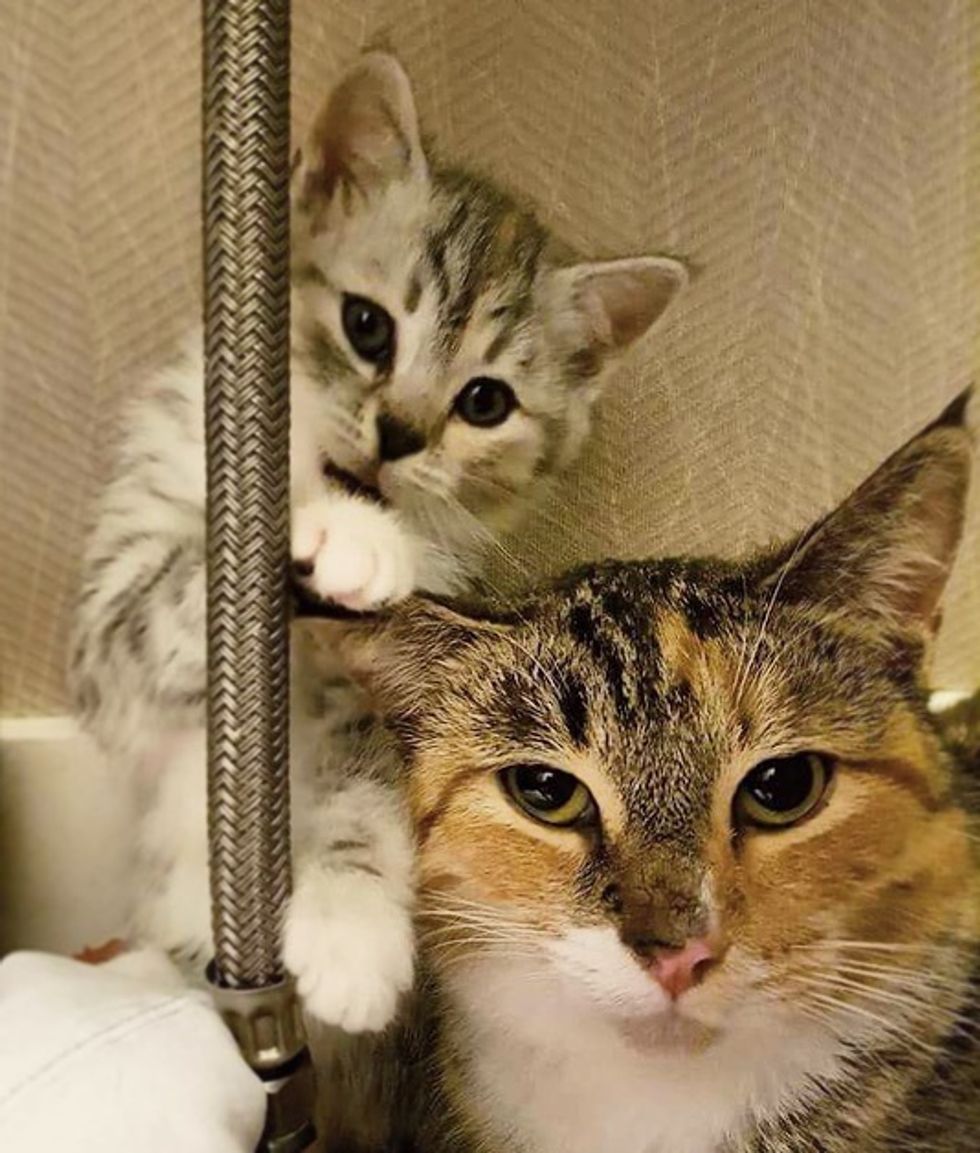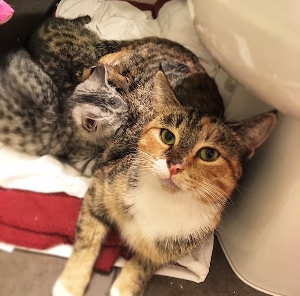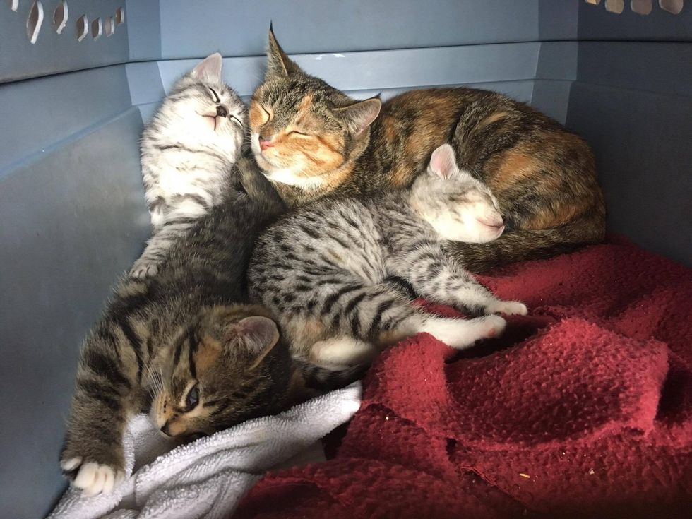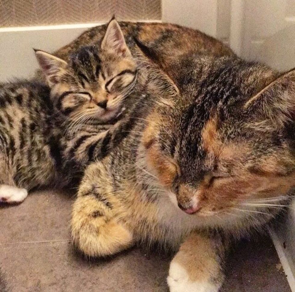 A loving tortie cat mama was found sheltering her babies from the rain behind a shovel. After being rescued, she hasn't left her kittens' side and is there for them every step of the way.