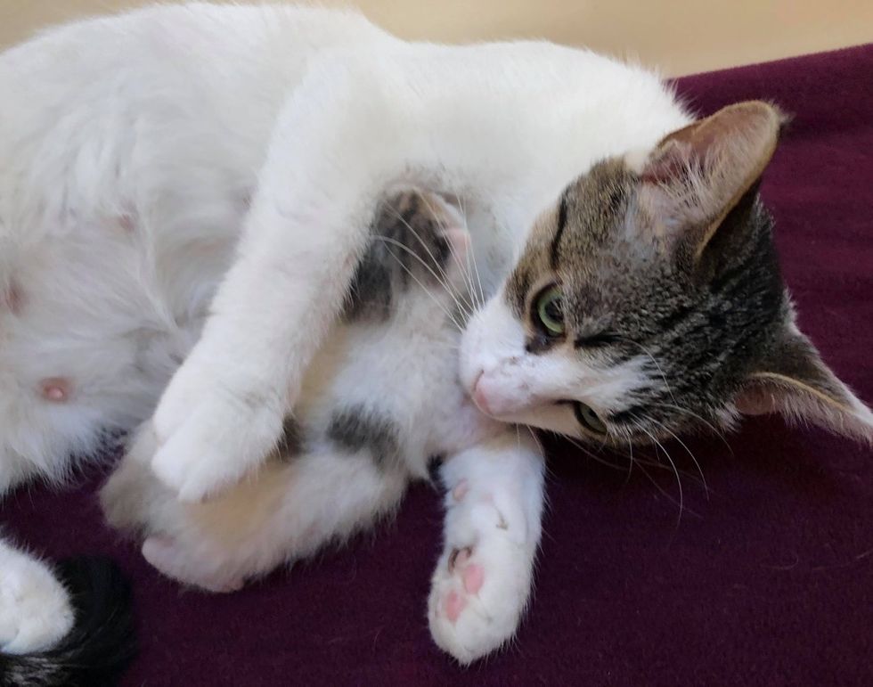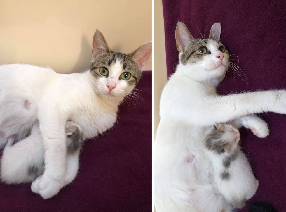 The former stray is so happy to have a quiet and safe place to raise her kitten and kind people to look after them.