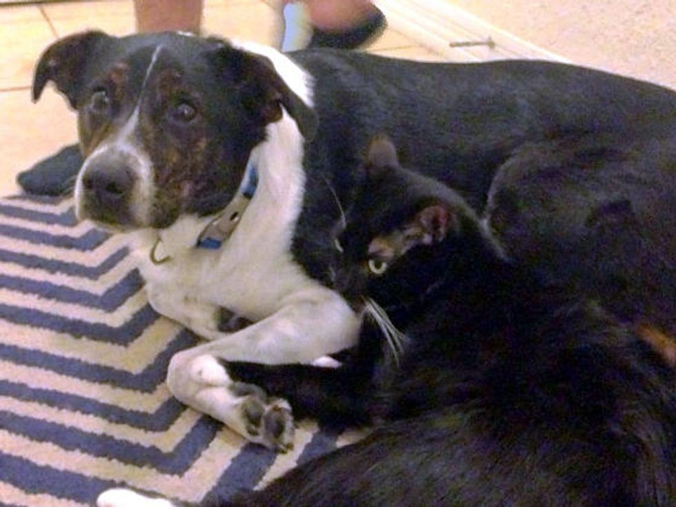 "Boots was a 3 month old kitten at the time, and he would interact with Diego and follow him around whenever we went for walks, usually in the back yard. We thought it was strange they got along so well!"