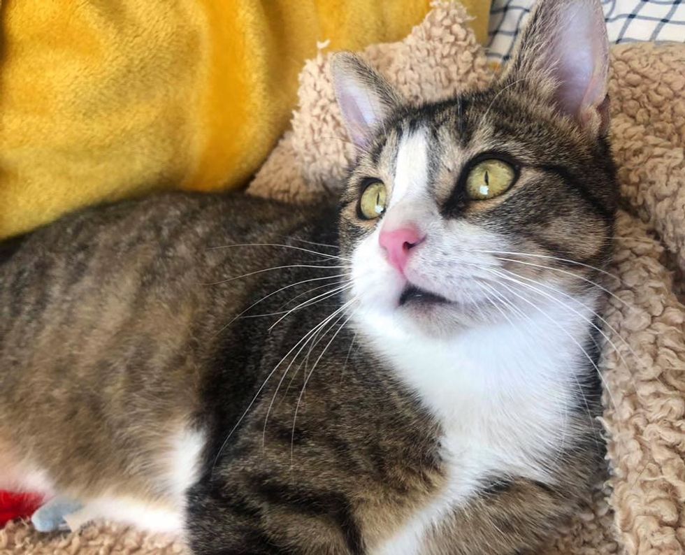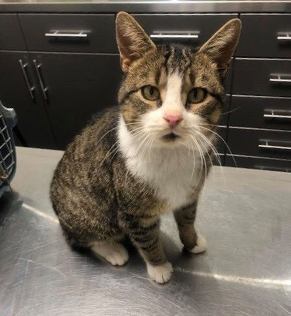 The tabby cat walked up to the perfect home for help, and is now living the VIP life as an indoor cat.