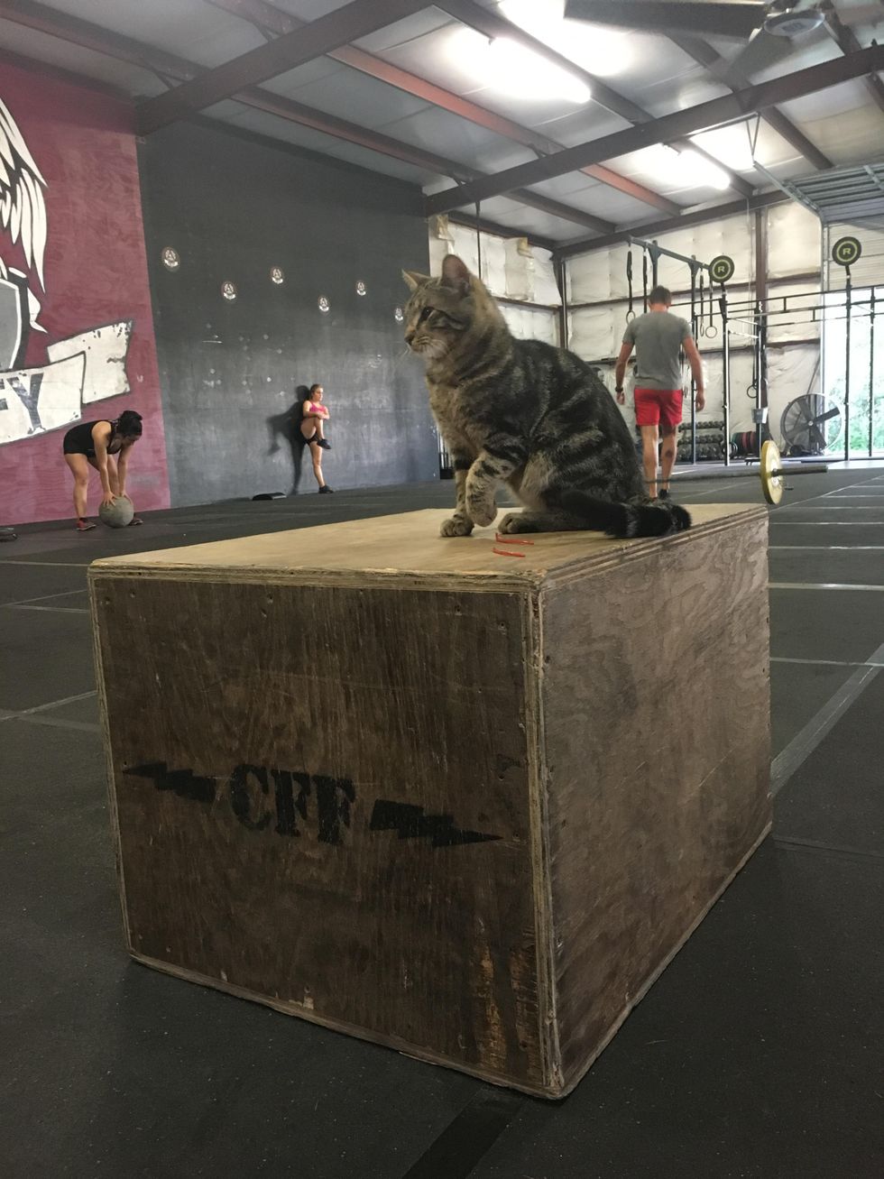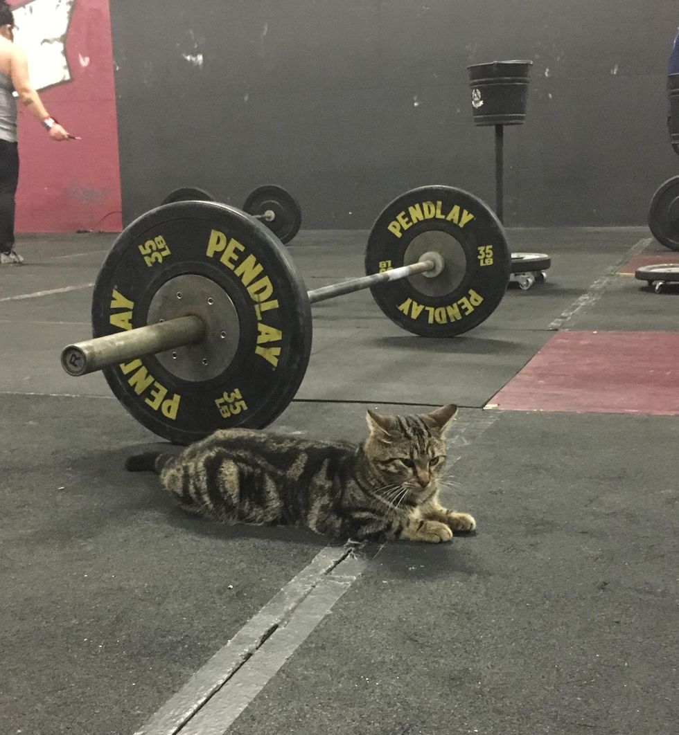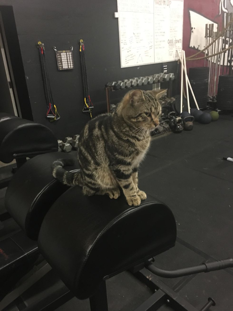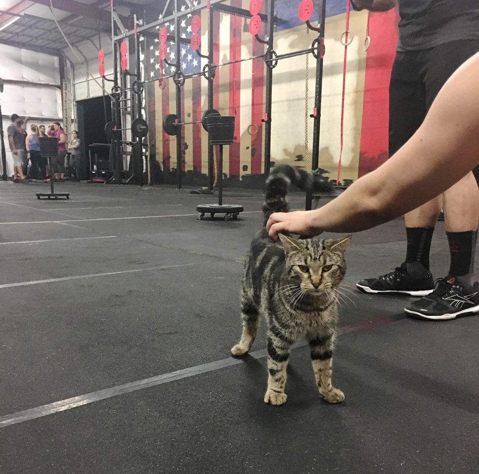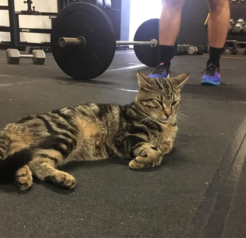 A stray cat sauntered into a local crossfit gym one night and decided to stay and offer motivation to his human friends.