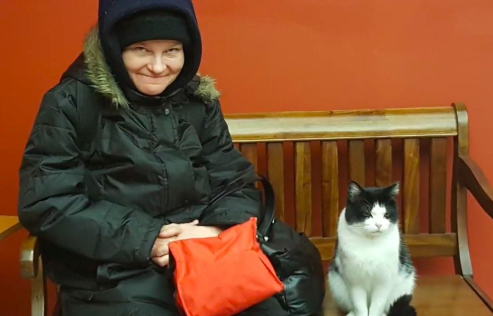 Sometimes she sits on the bench to keep residents company while they are waiting for their ride. This sweet-natured kitty has added so much joy into people's lives there.