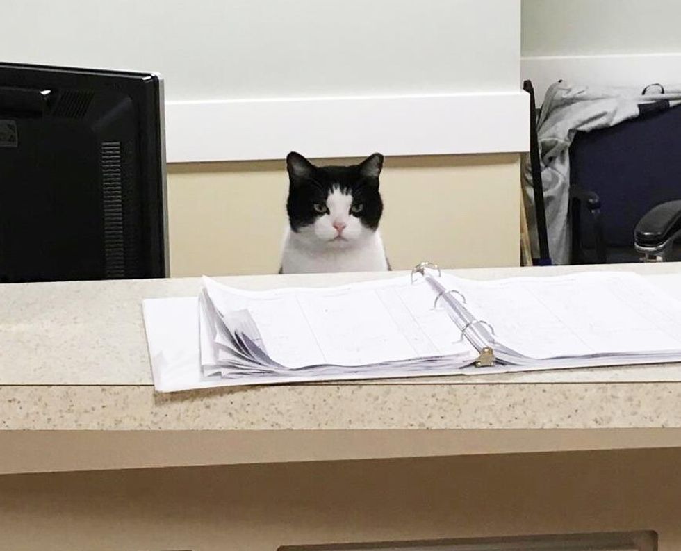 The friendly feline quickly crept her way into everyone's heart, and before they knew it they had a kitty sitting behind the reception desk helping her human friend with day to day work.