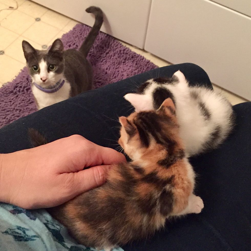 "I put a couple kittens on my lap and Mama Cat jumped up for her share of the head scratches. While she was up there, the kittens kept trying to nurse. As a nursing mom, I feel for this mama cat," imgur user Eeksy said.