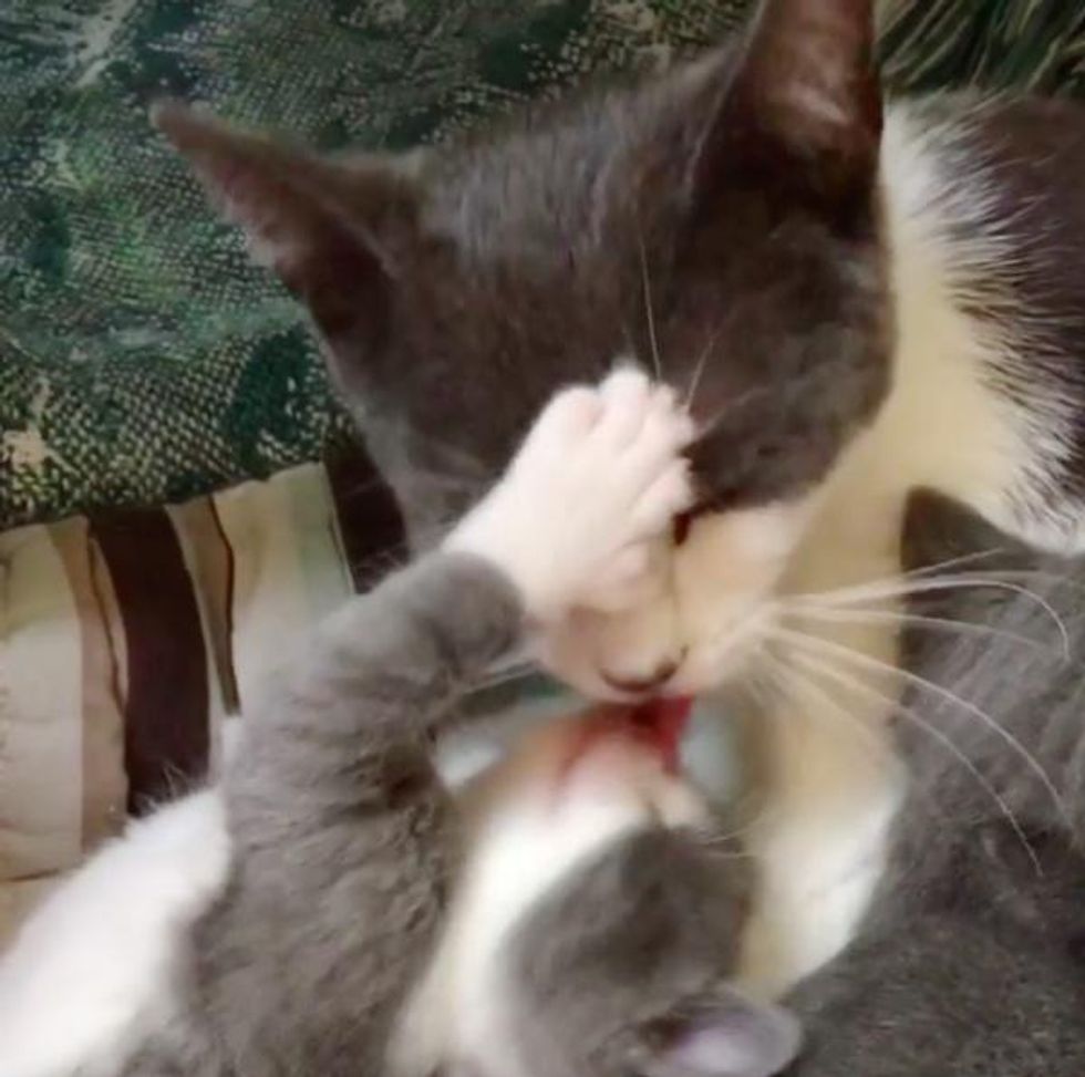 "Mom and all babies are all polydactyls, which means they have an extra thumb. It makes them look like they are all wearing mittens."