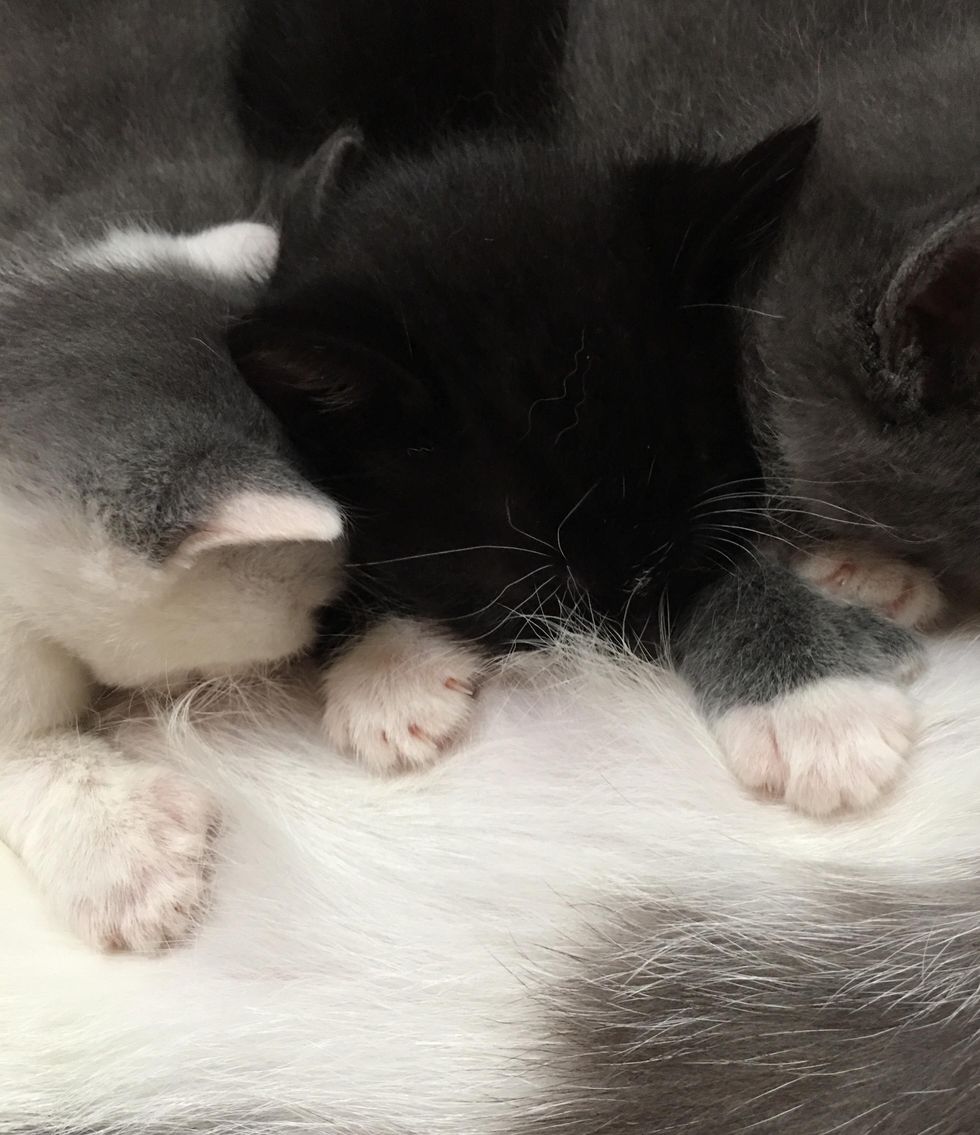 "Boys are Chunk, Ducky, Mr Boo (all grey) and the girls are Moo (black and white) and Bubbles (the tiny white one)," Leslie told Love Meow.