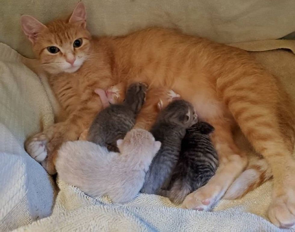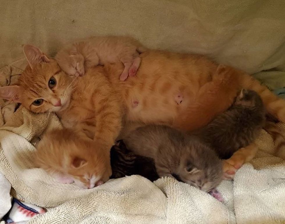 The cat mom washed all her babies from head to toe and started nursing and caring for them around the clock.