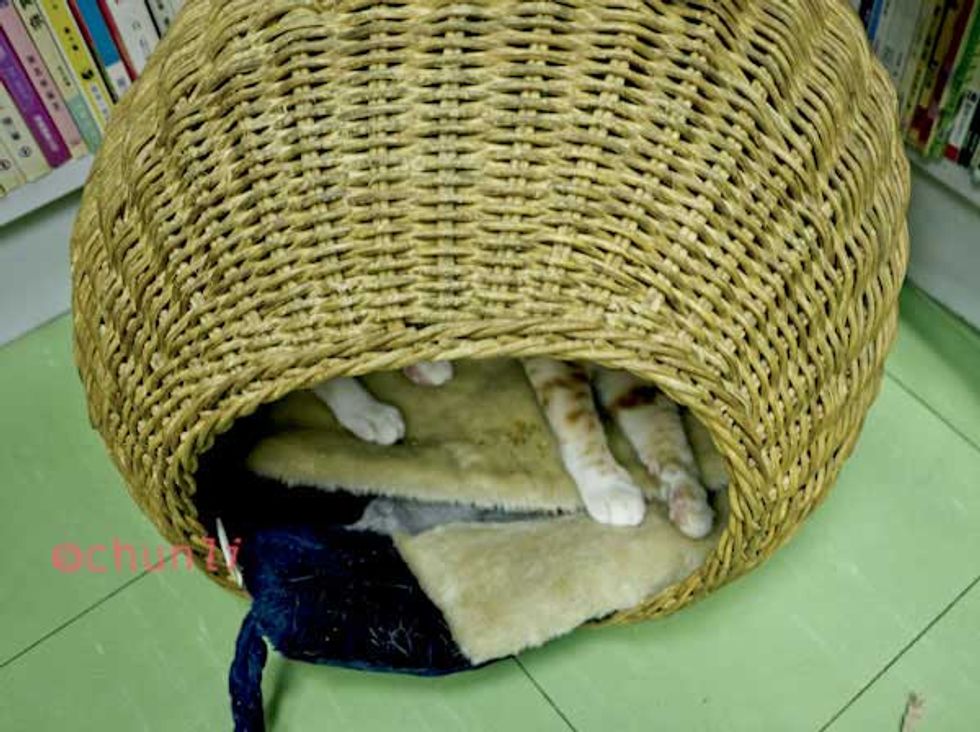 In every corner of the store, there is a cat bed for the kitties to nap in.