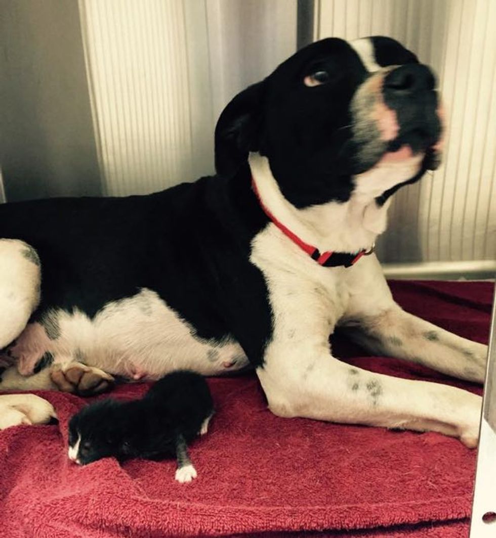 The unlikely pair were rescued and taken to the Mercy Animal Clinic in Garland, Texas. The little baby kitten, less than 10 days old, has been nursing on the dog mama for milk.