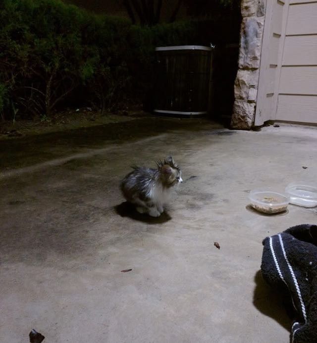 They put a bowl of cat food out trying to get closer to the kitty. "We waited for over an hour, softly calling into the dark."
