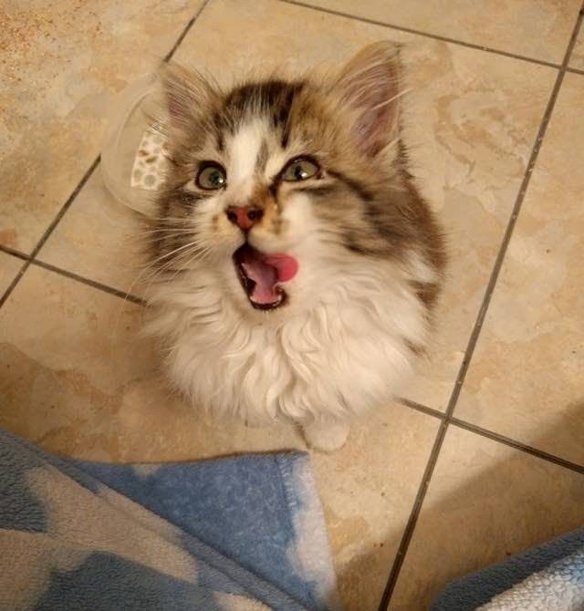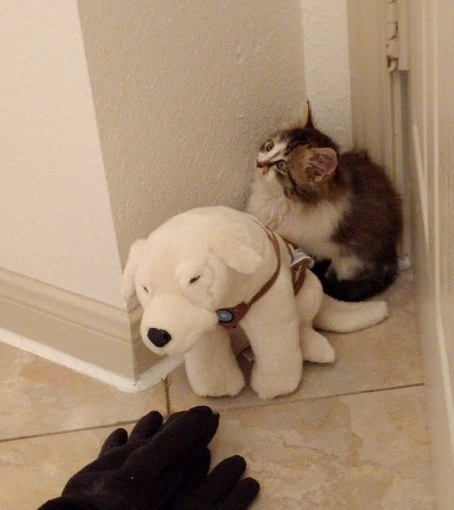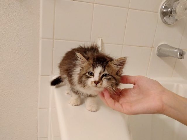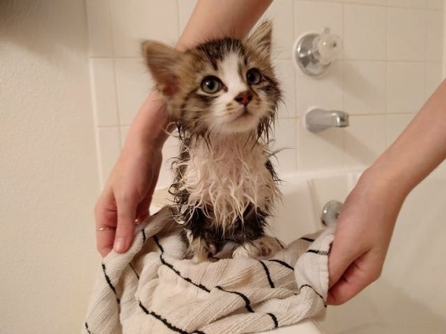 "While I swept the area around our house, looking for signs of any mother cats or other stray kittens, my girlfriend got her into our bathroom where she could dry off."
